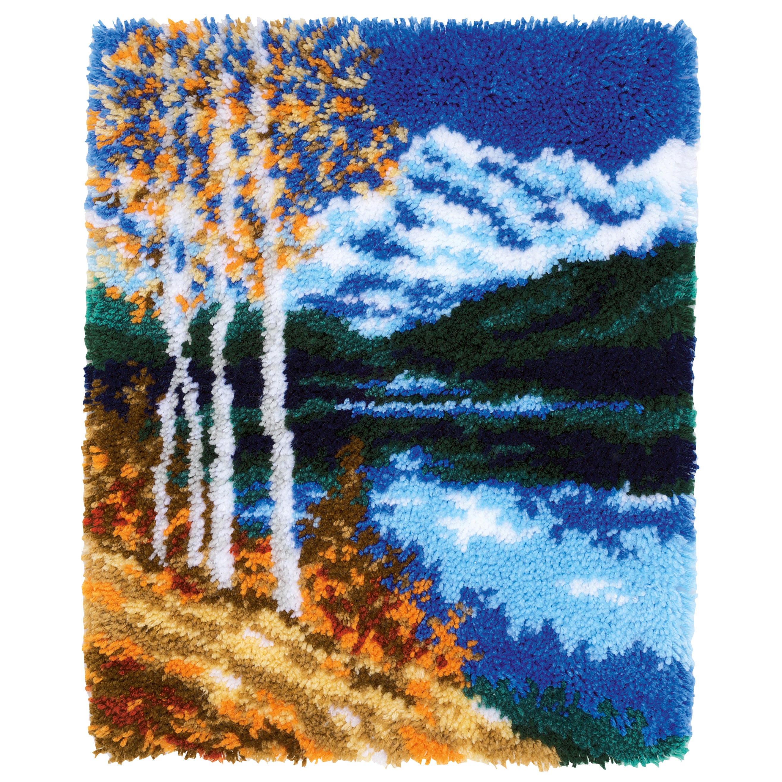 - Kit includes: hand painted, 52% cotton/48% polyester, large hole (18 holes/10cm, 4.5 stitches /inch) canvas; cut packs of acrylic yarn; latch hook; binding for finishing; front sheet picture and instructions in 8 languages (EN, NL, FR, GER, IT, SP, RU, SW).