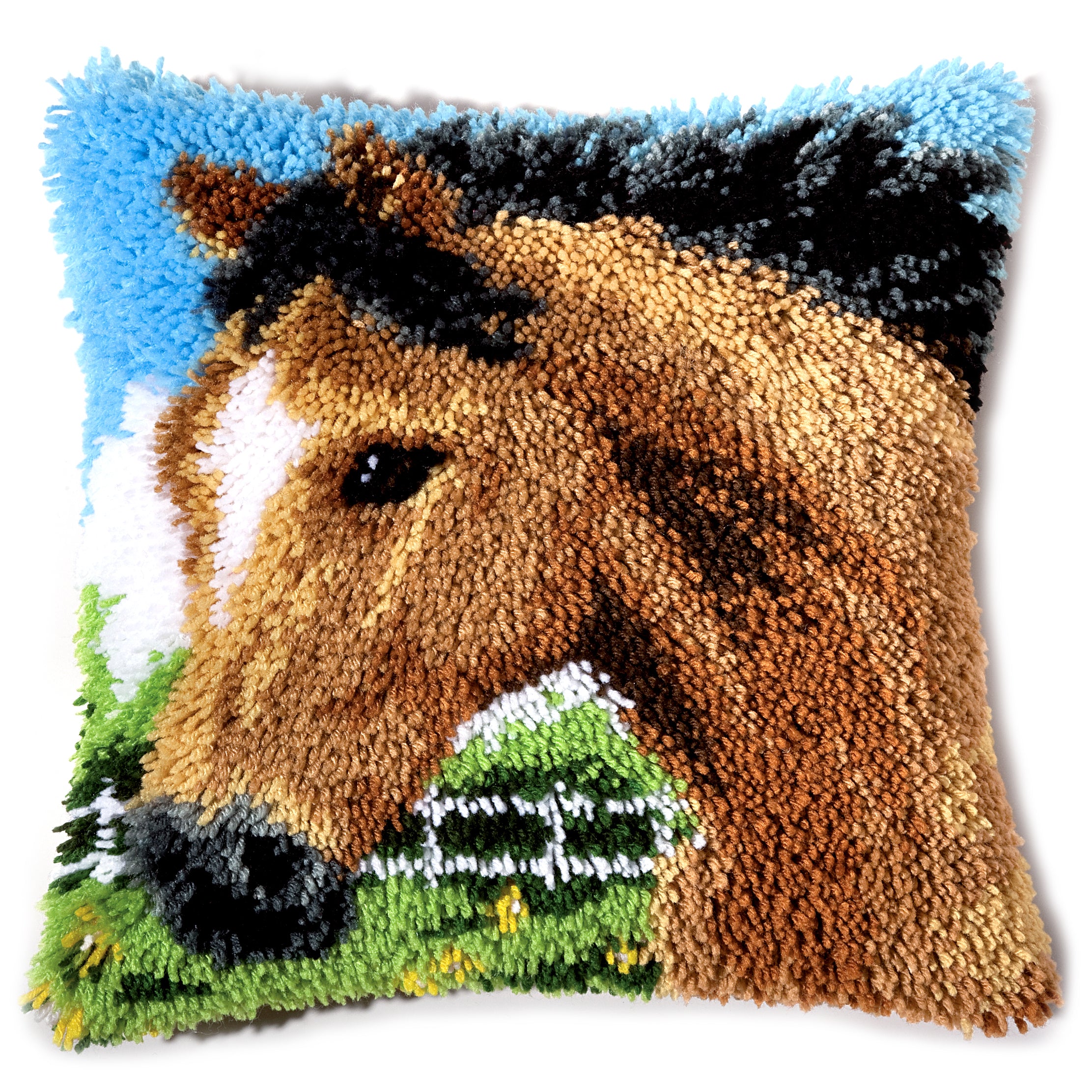 - Kit includes: hand painted, 52% cotton/48% polyester, large hole (18 holes/10cm, 4.5 stitches /inch) canvas; cut packs of acrylic yarn; latch hook; front sheet picture and instructions in 8 languages (EN, NL, FR, GER, IT, SP, RU, SW).