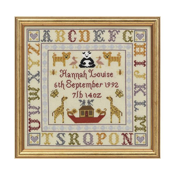 A traditional Sampler featuring Noah's Ark and some of his animals. The design is surrounded by an elaborate alphabet. This