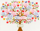 This design features a detailed tree with space for the childs name along with the names of parents, grandparents and great grandparents.