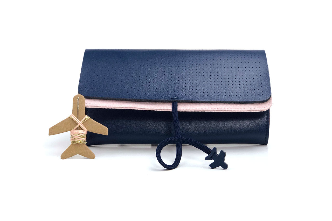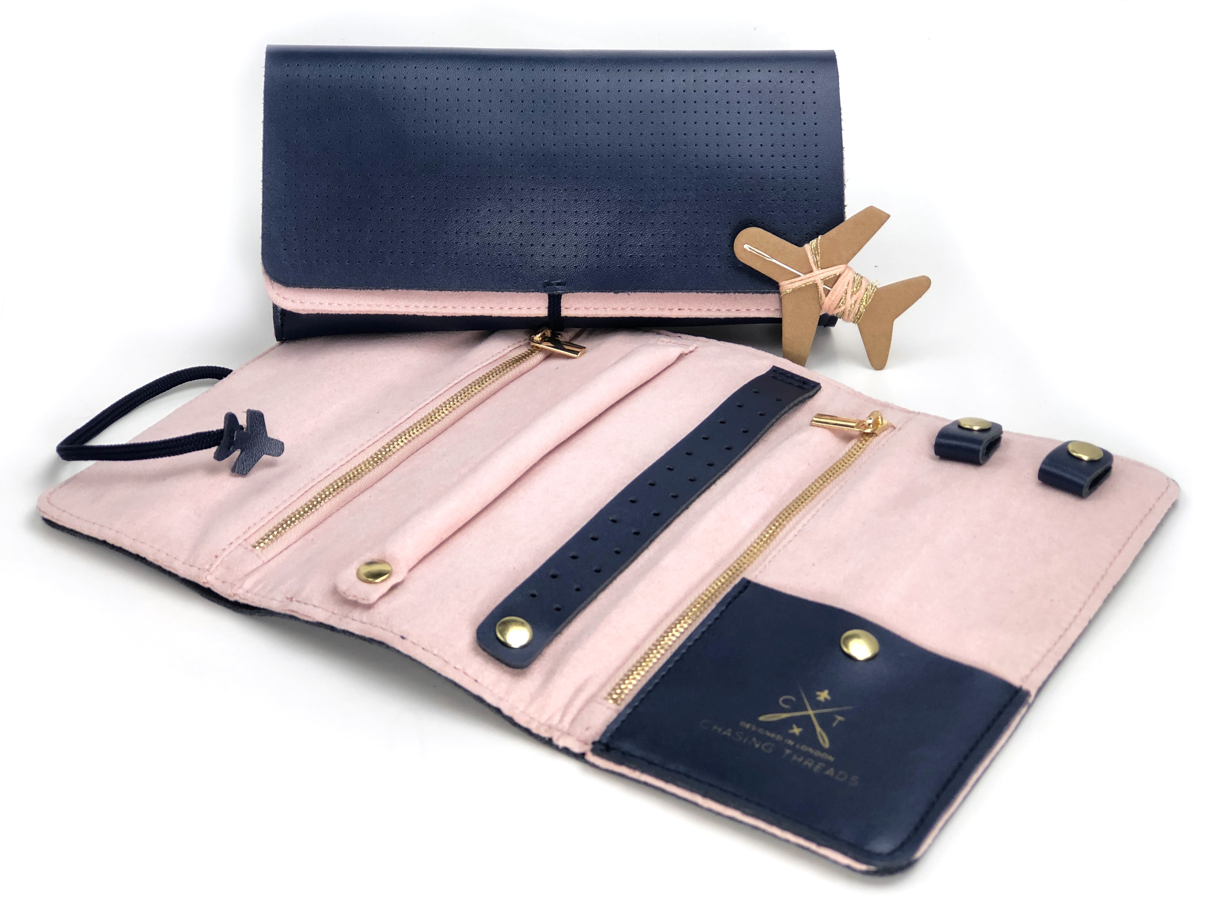 Secure the wrap with the ‘around the world’ aeroplane cord to keep your precious jewellery safe within your suitcase. The genuine leather exterior is perforated at the front, so it can be stitched with initials, a zodiac sign, patterns or any unique design.