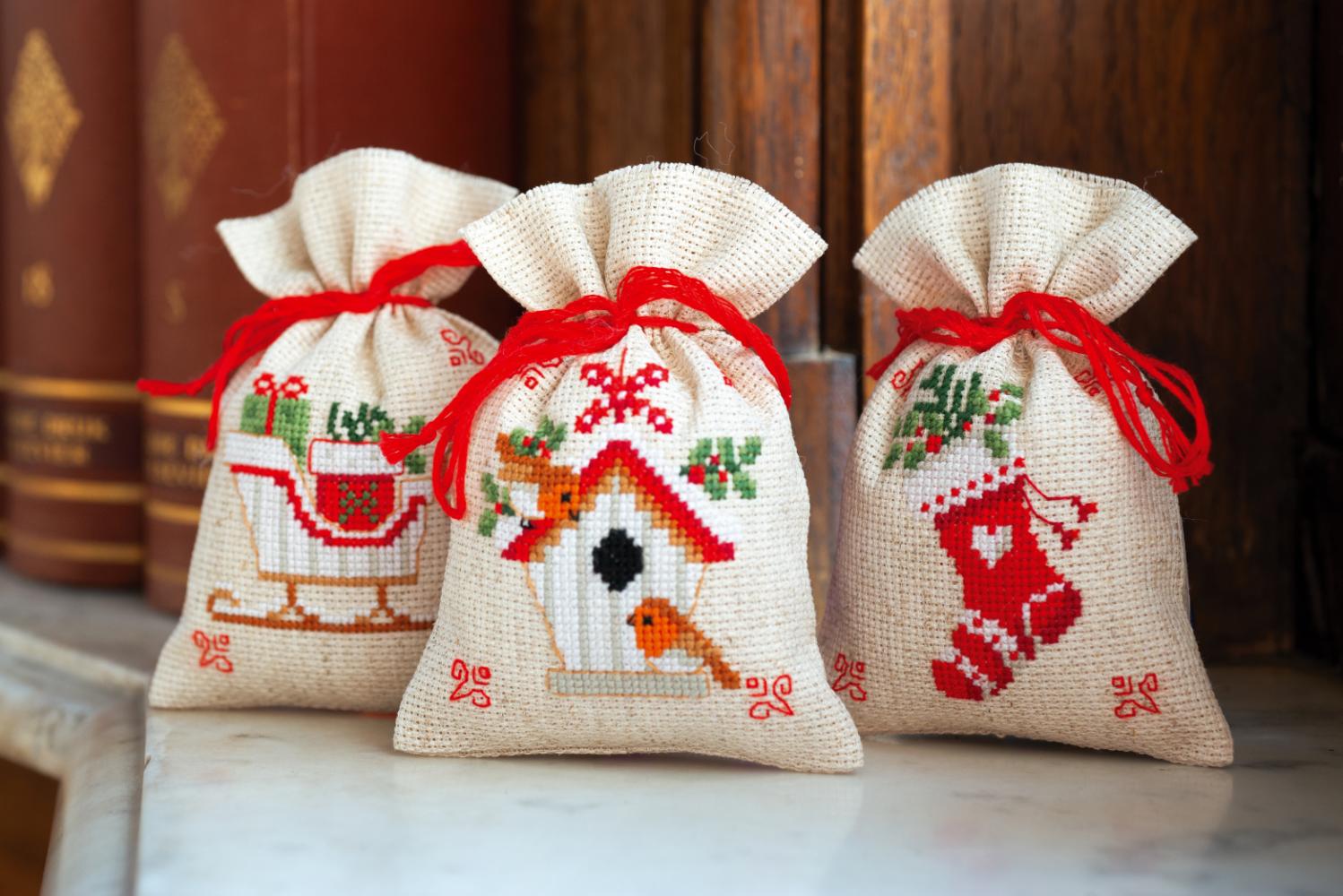 - Set of 3 gift or pot pourri bags with counted cross stitch designs.