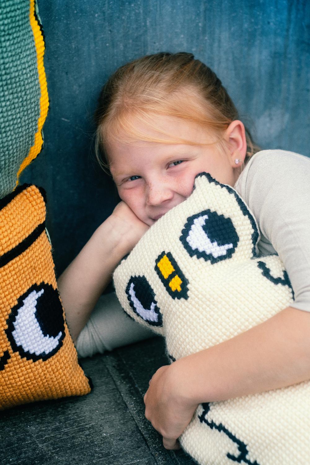 - Kit includes: hand-painted, cotton, large hole canvas fabric (18 holes/10cm, 4.5 stitches/inch); thick acrylic yarn; needle, label, cushion back, front sheet picture and instructions in 8 languages (EN, NL, FR, GER, IT, SP, RU, SW).
