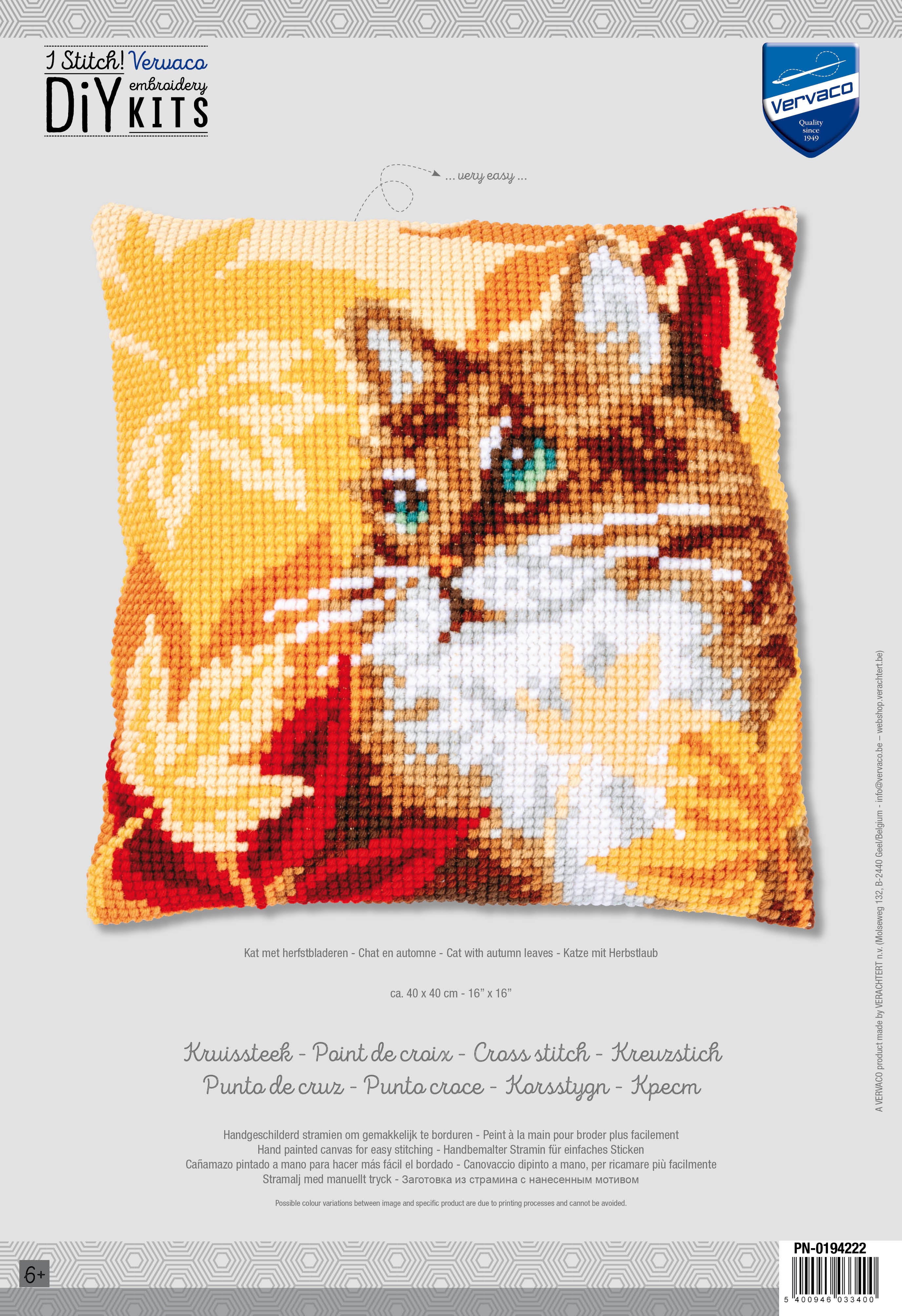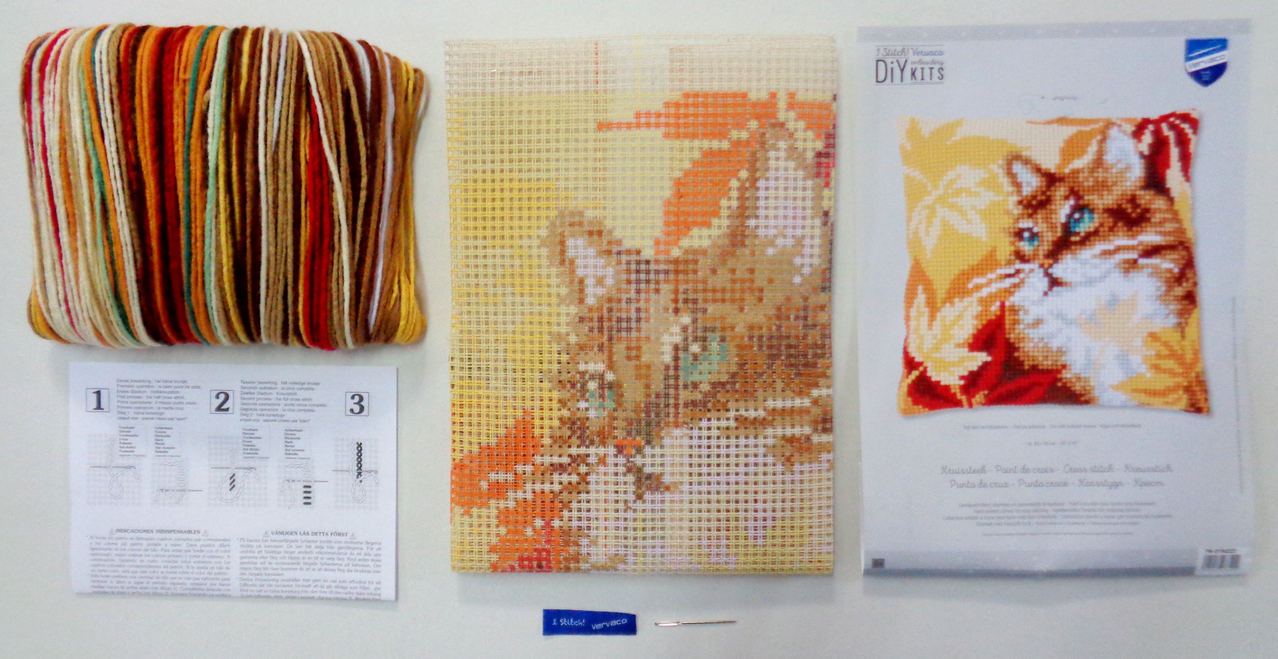 - Cross stitch cushion kit. Kit includes: hand painted, large hole canvas; thick acrylic yarn; needle; I Stitch by Vervaco" DIY-label; front sheet picture and instructions in eight languages (EN, NL, FR, GER, IT, SP, RU, SW).