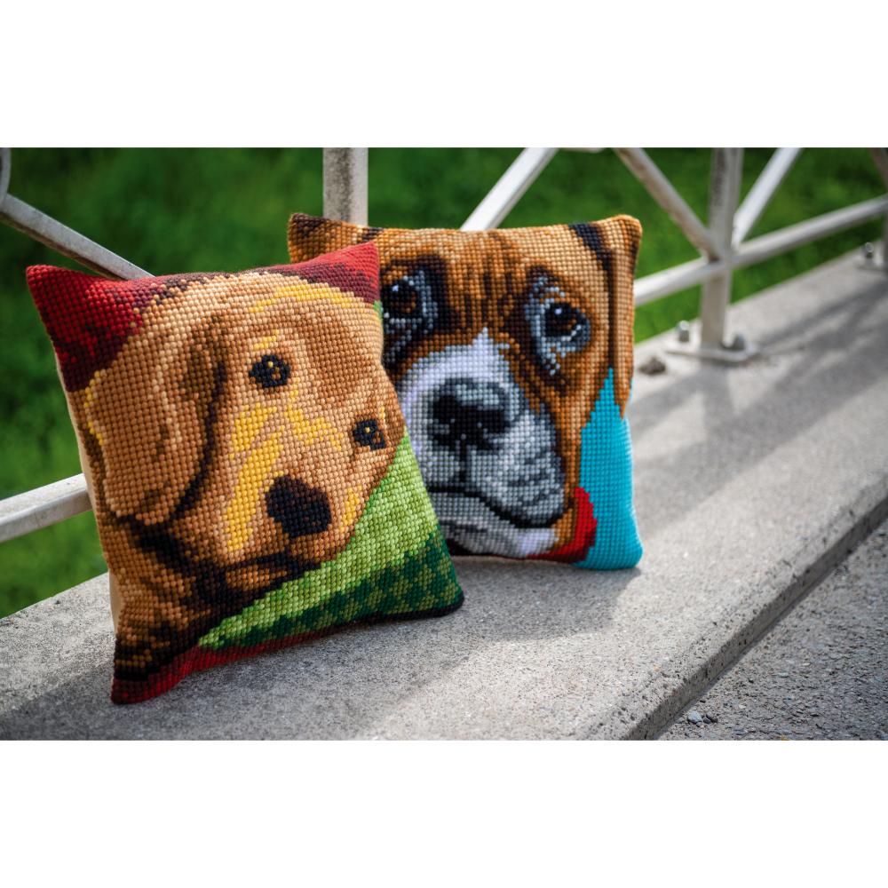 - Cross stitch cushion kit. Design to be created on hand painted, ecru, cotton, large hole canvas: 18 holes/10cm, 4.5 stitches/inch. Thick yarn: 100% acrylic.