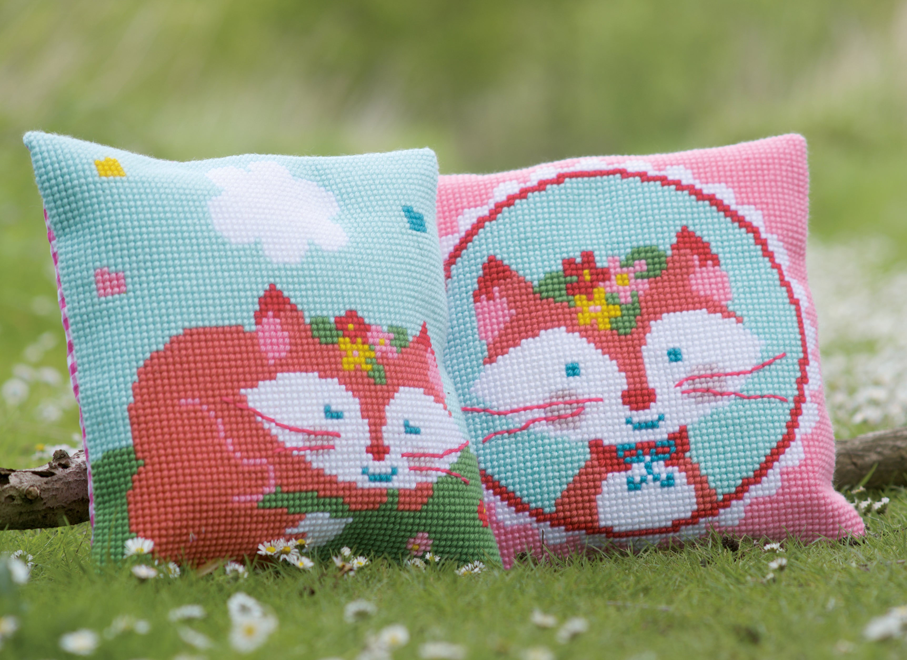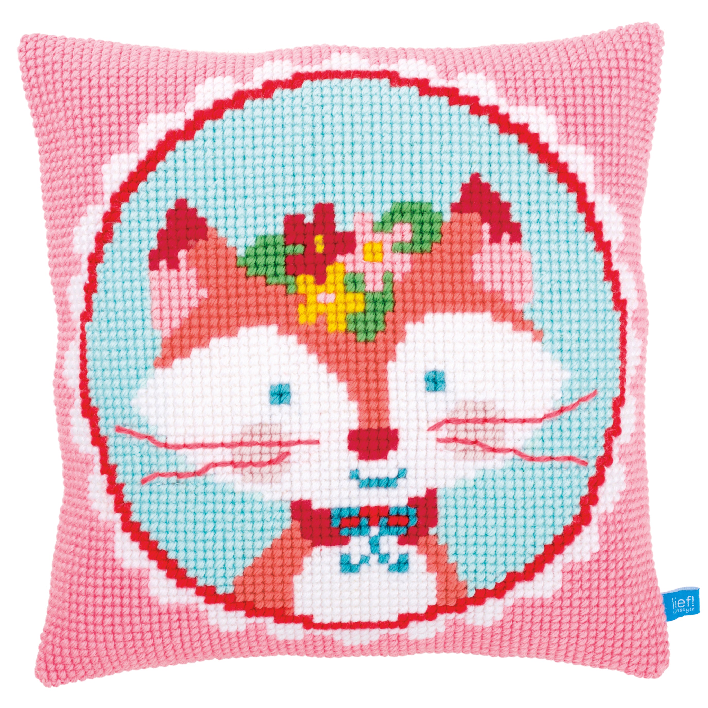 - Cushion with cross stitch design.