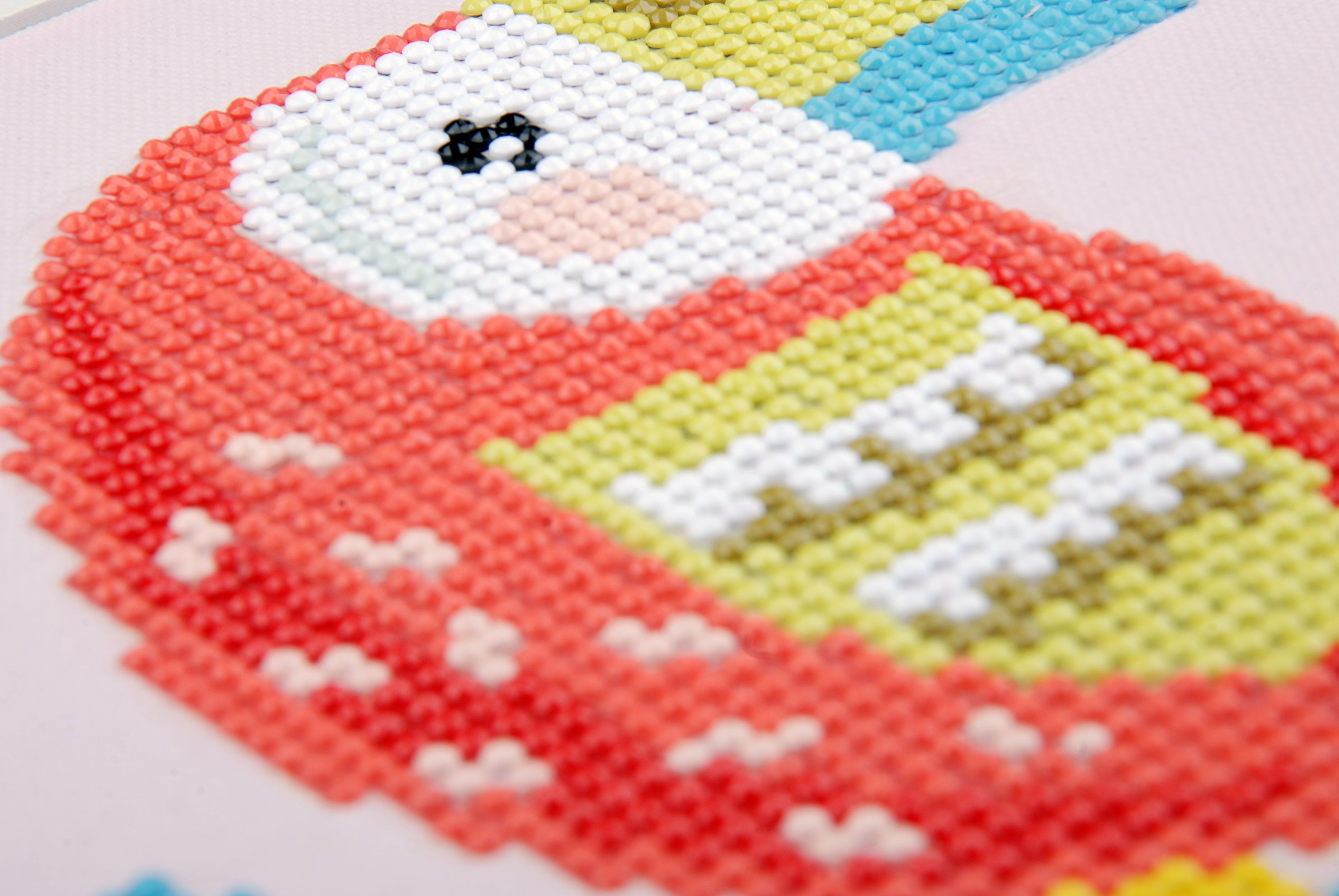 - Kit includes: high quality colour printed, 100% polyester fabric; diamond-like facets pre-sorted by number; plastic bags for storing sorted 'diamonds'; 'diamond' applicator tool, craft tray and wax caddy; instructions.