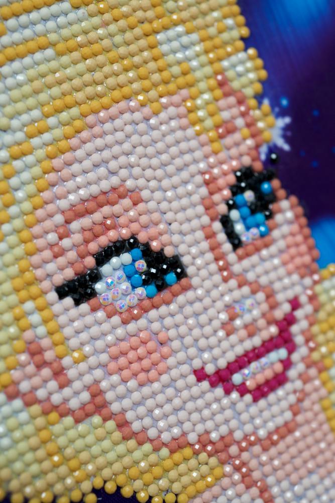 - Kit includes: high quality colour printed, 100% polyester fabric; diamond-like facets pre-sorted by number; plastic bags for storing sorted 'diamonds'; 'diamond' applicator tool, craft tray and wax caddy; instructions.