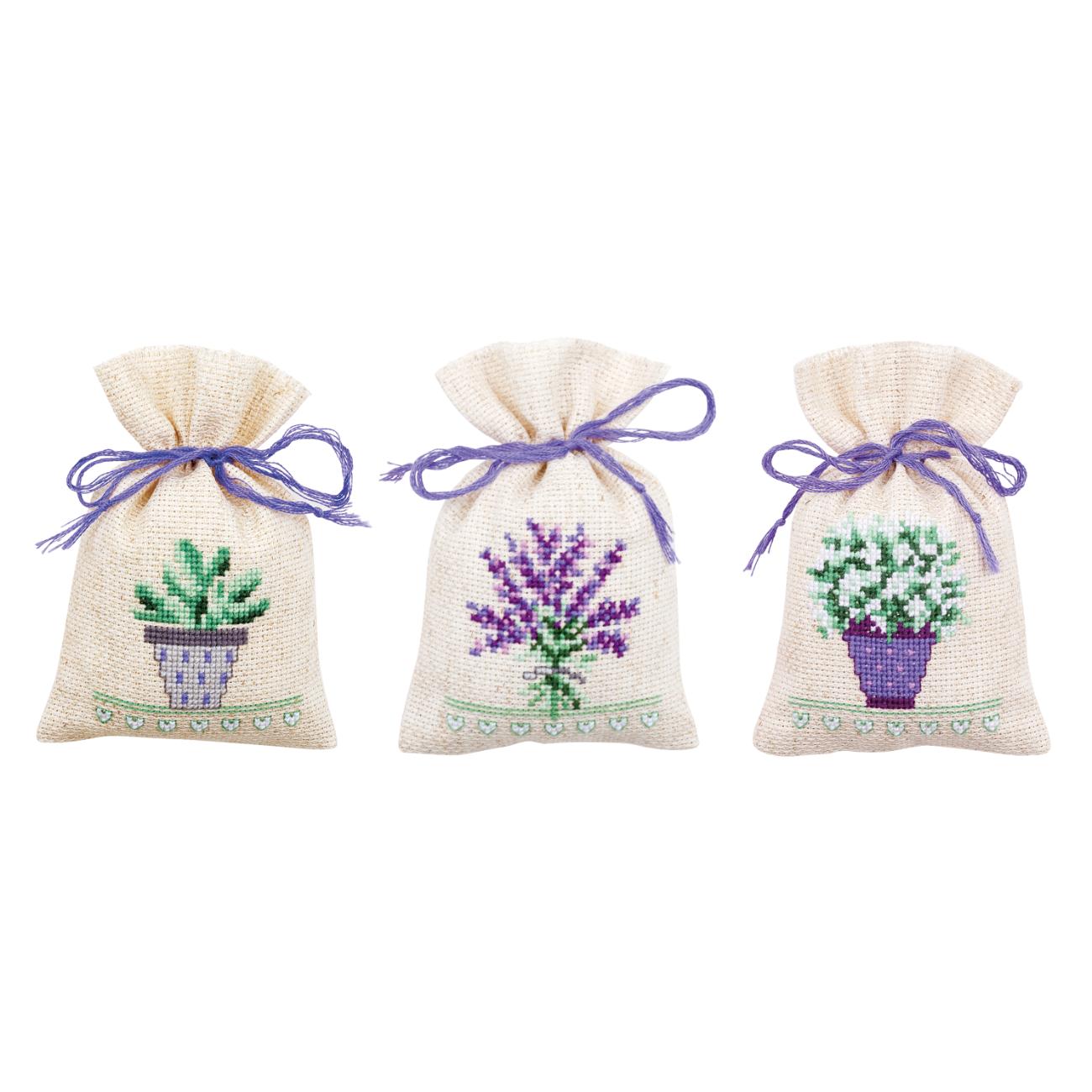 - Set of 3 gift or pot-pourri bags with counted cross stitch designs. Kit includes: 14 count, ecru, linen-look, pre-finished, aida fabric bags; pre-sorted, stranded cotton threads; needle; large-square charted design; frontsheet picture; instructions in 8 languages (EN, NL, FR, GER, IT, SP, RU, SW).