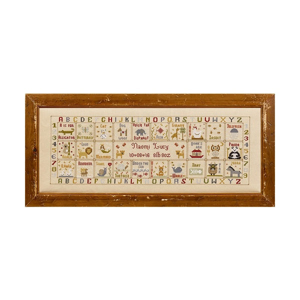 A truly beautiful heirloom Birth Sampler which would suit either a boy or a girl. The grid design features the whole alphabet and depicts a different animal in each box. Stitched in a lovely palette of muted shades which works really well with the specially dyed Zweigart fabric. There is enough thread for the name to be stitched in either blue or red.