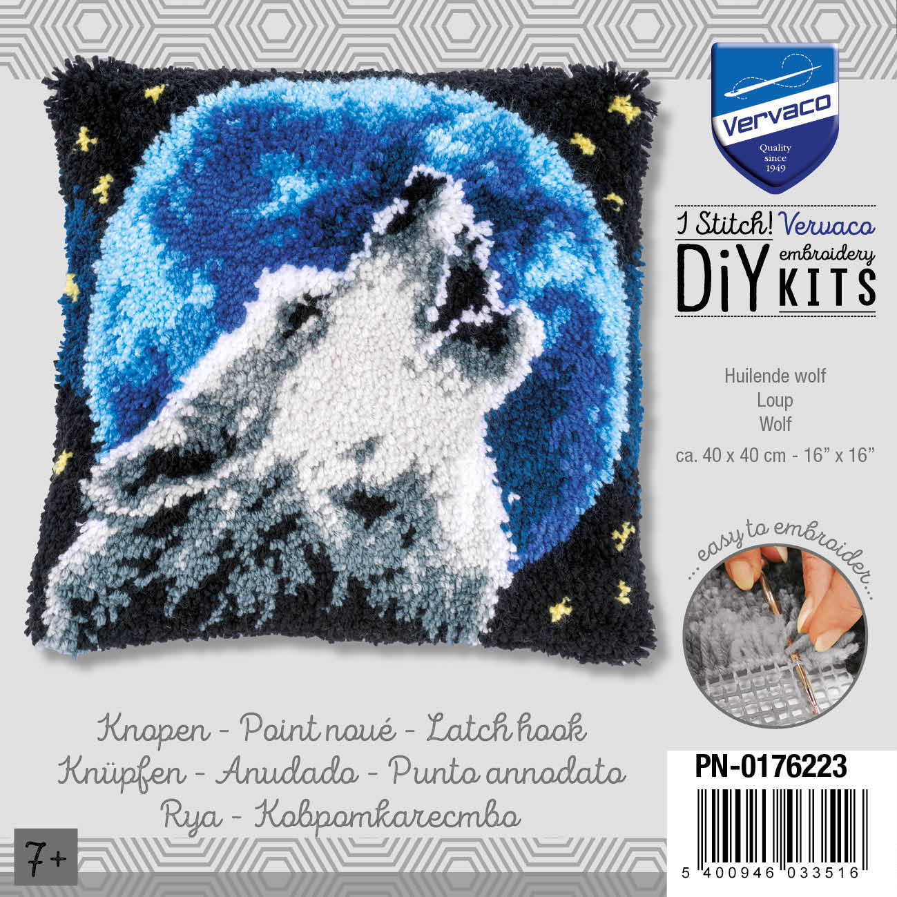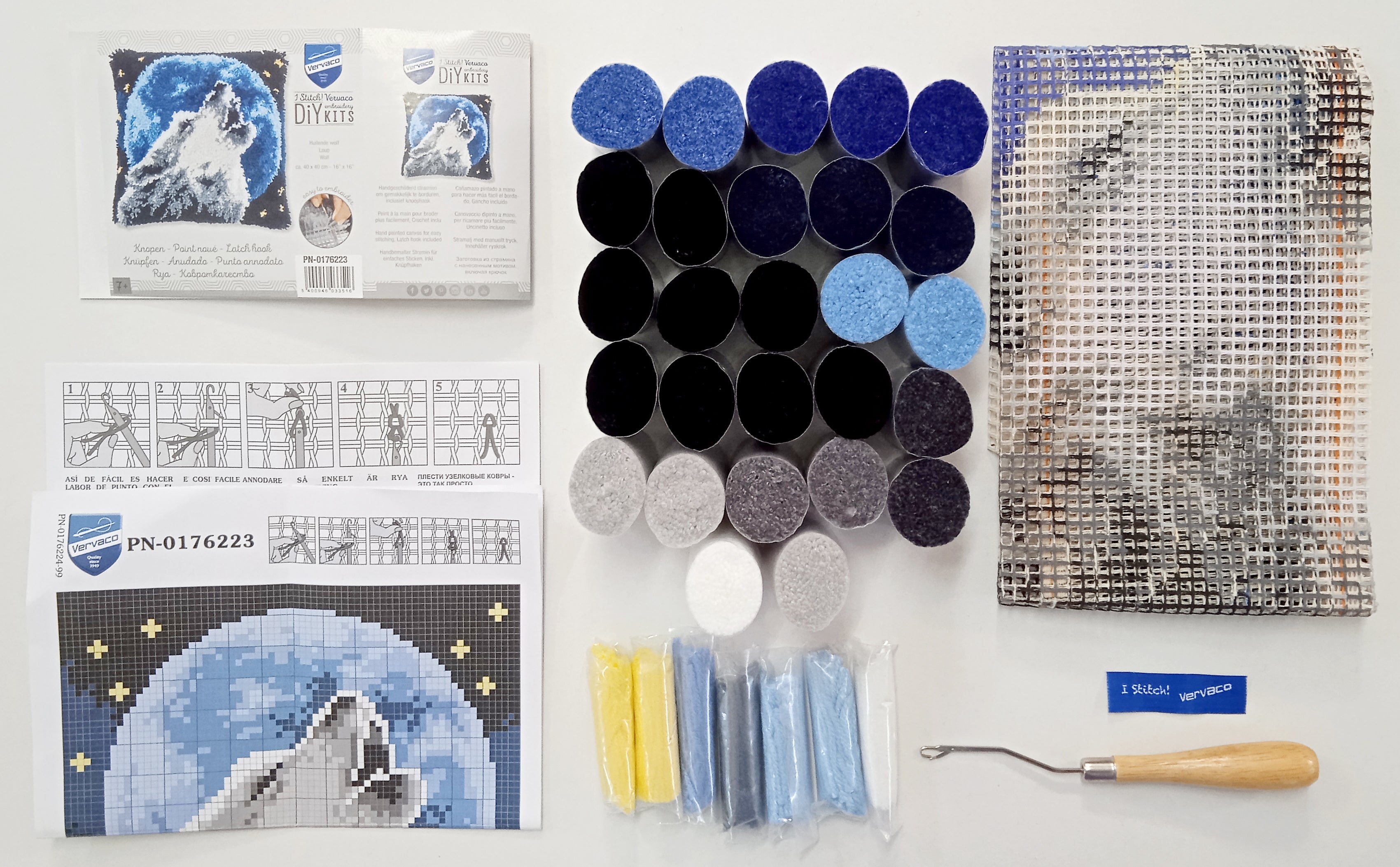 - Kit includes: hand painted, large hole canvas; cut acrylic yarn packs; latch hook; front sheet picture and instructions in eight languages (EN, NL, FR, GER, IT, SP, RU, SW).