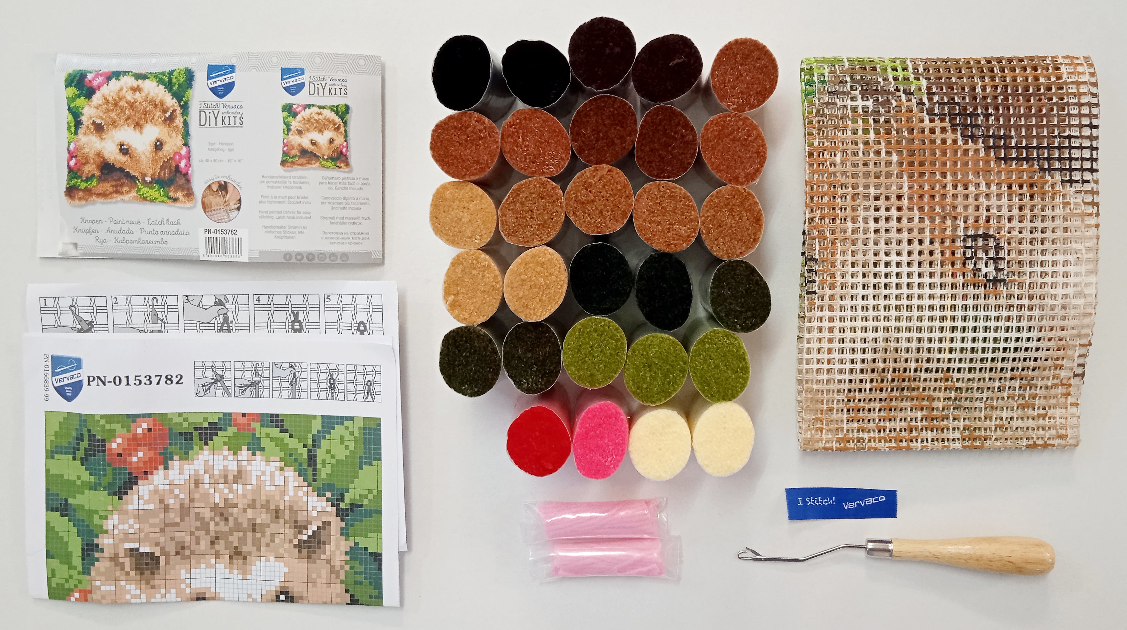 - Kit includes: hand painted, large hole canvas; acrylic cut yarn packs; latch hook; front sheet picture and instructions in eight languages (EN, NL, FR, GER, IT, SP, RU, SW).