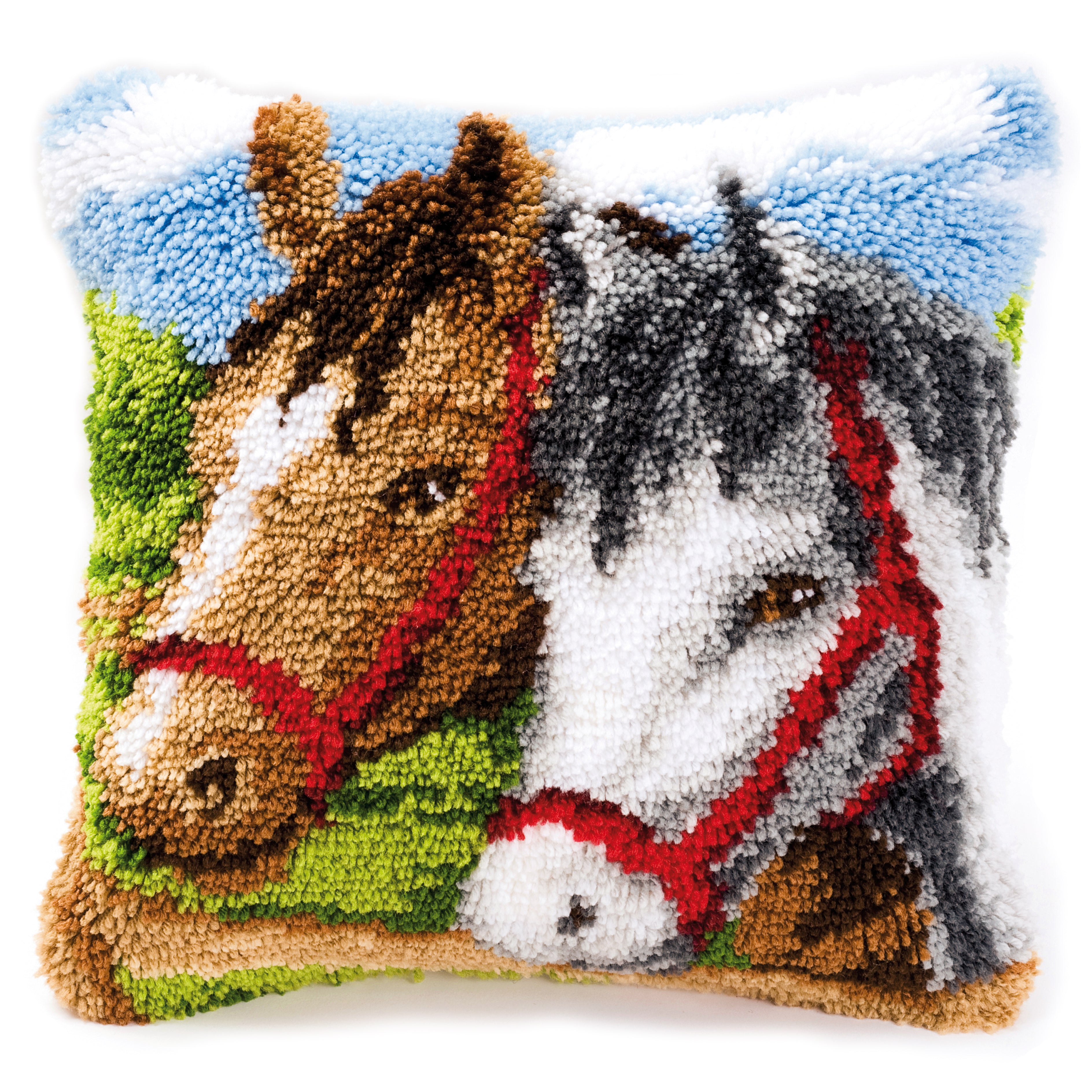 - Kit includes: hand painted, 52% cotton/48% polyester, large hole (18 holes/10cm, 4.5 stitches /inch) canvas; cut packs of acrylic yarn; latch hook; front sheet picture and instructions in 8 languages (EN, NL, FR, GER, IT, SP, RU, SW).