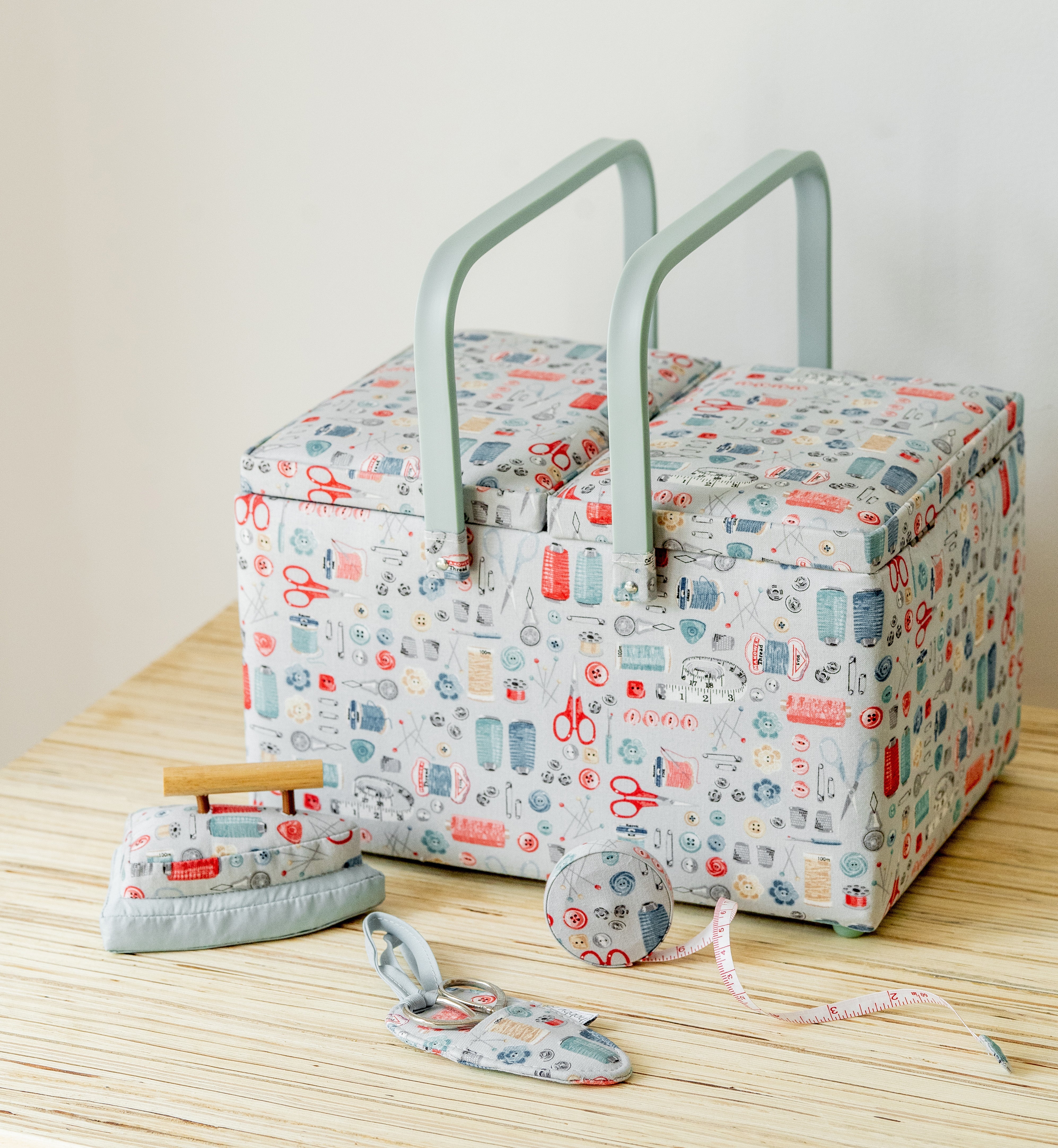 Hobbygift ~ Twin Lid Large Sewing Box, Iron Pin Cushion, Tape Measure and Scissors in Case ~ Stitch in Time ~ Matching Set