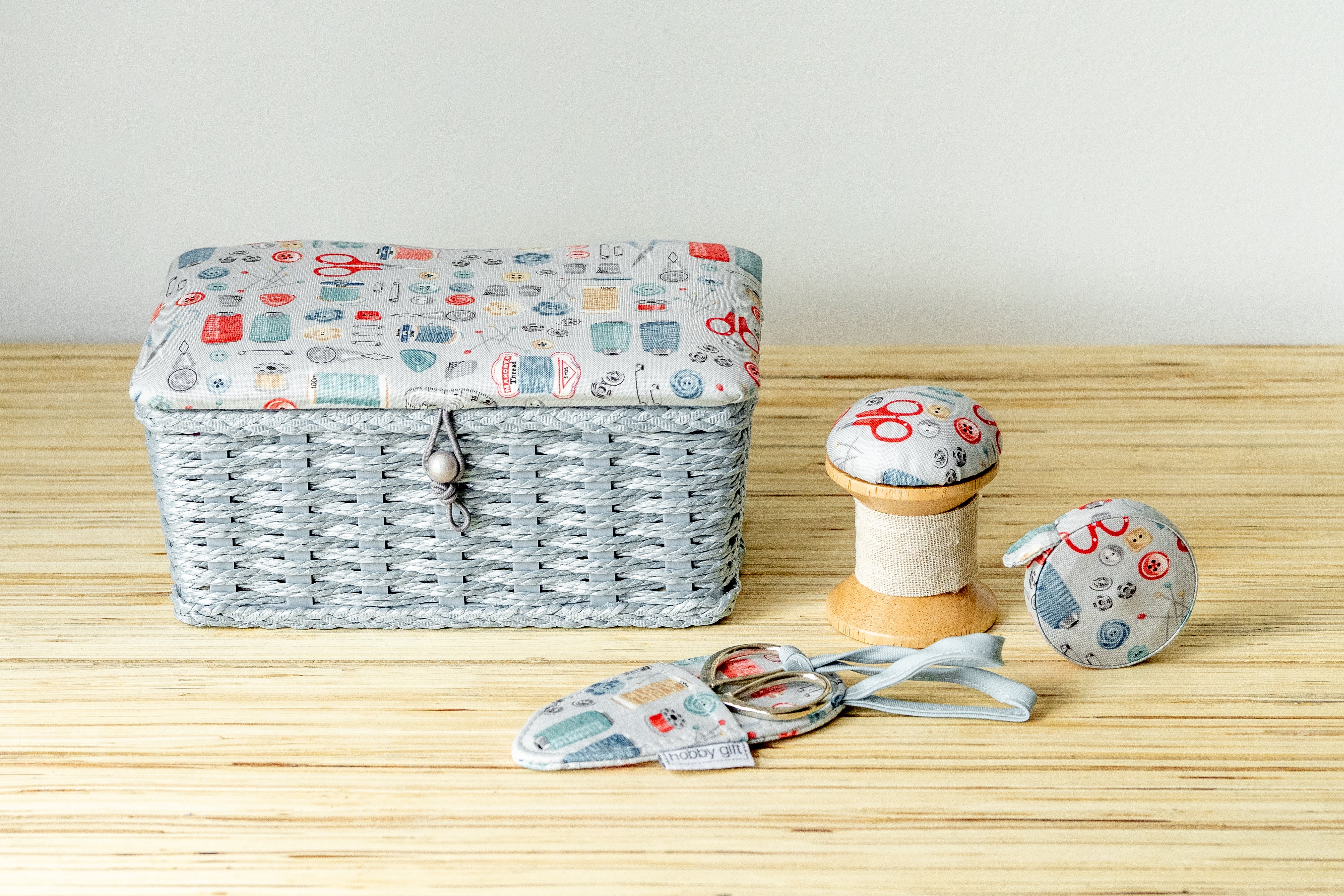 Woven Basket, Pin Cushion, Tape Measure and Scissors in Case - Stitch In Time - Matching Set
