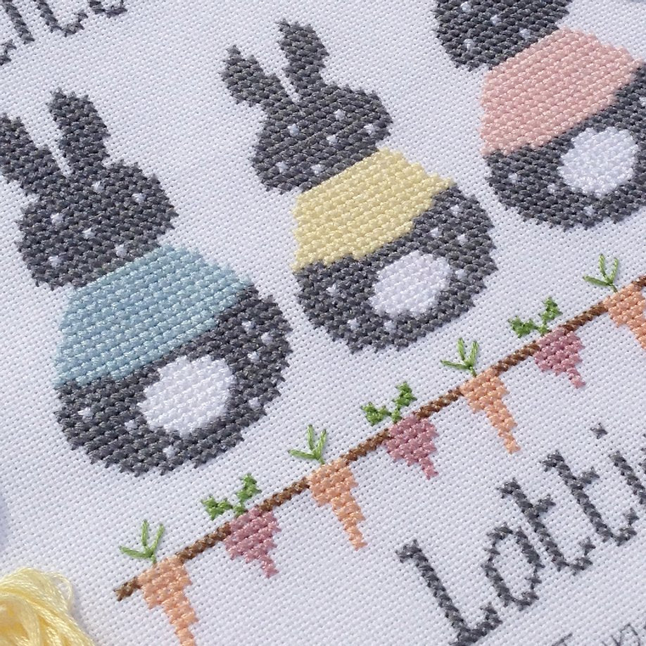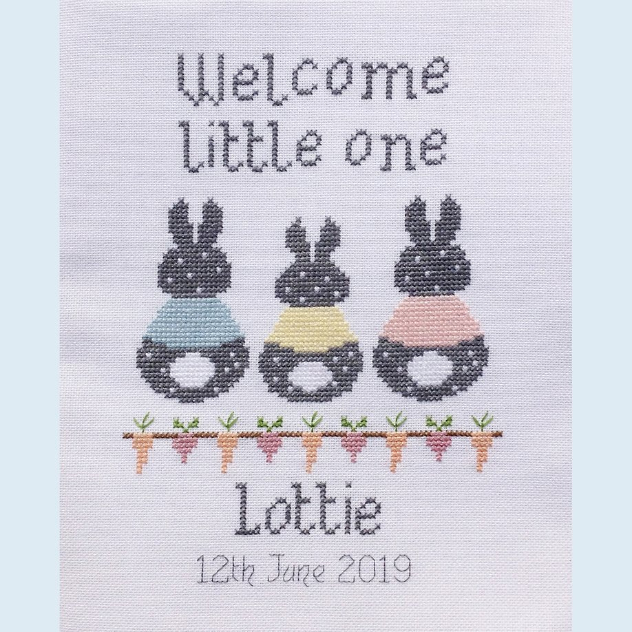 Welcome a new little one into the world with this contemporary bunny themed cross stitch design, featuring Daddy bunny, Mummy bunny and a sweet 'little one', sitting in a row next to the carrots and radish.