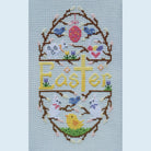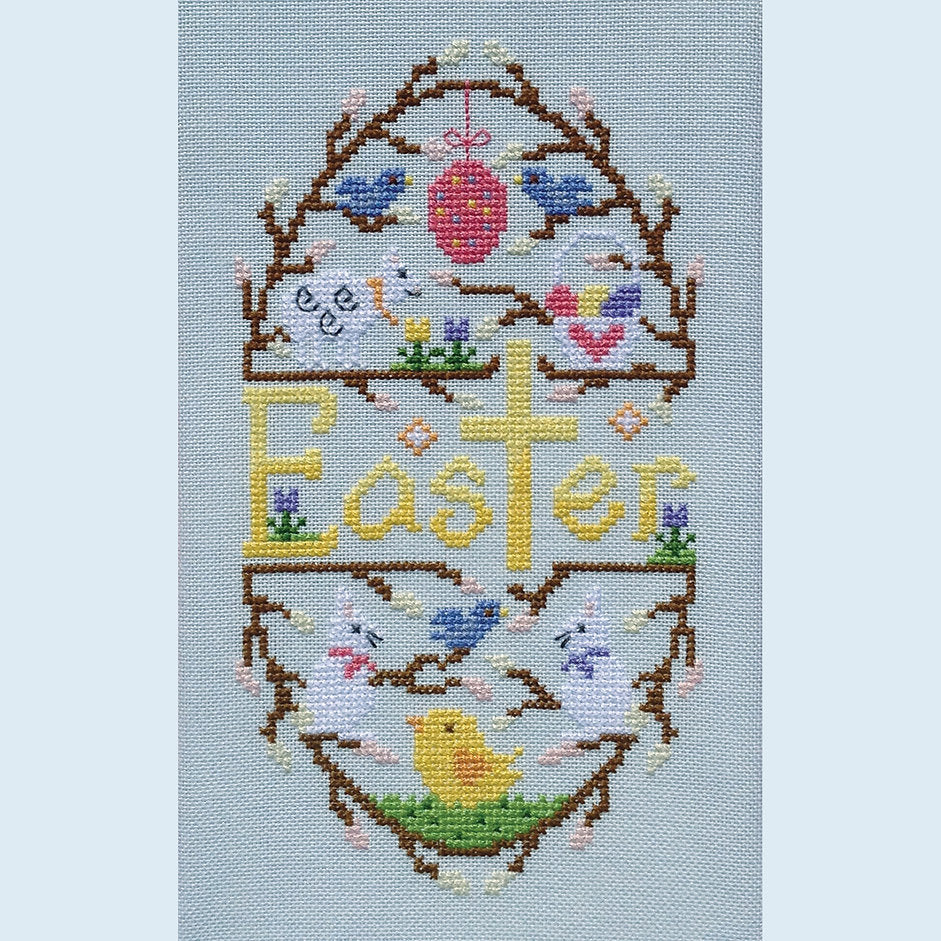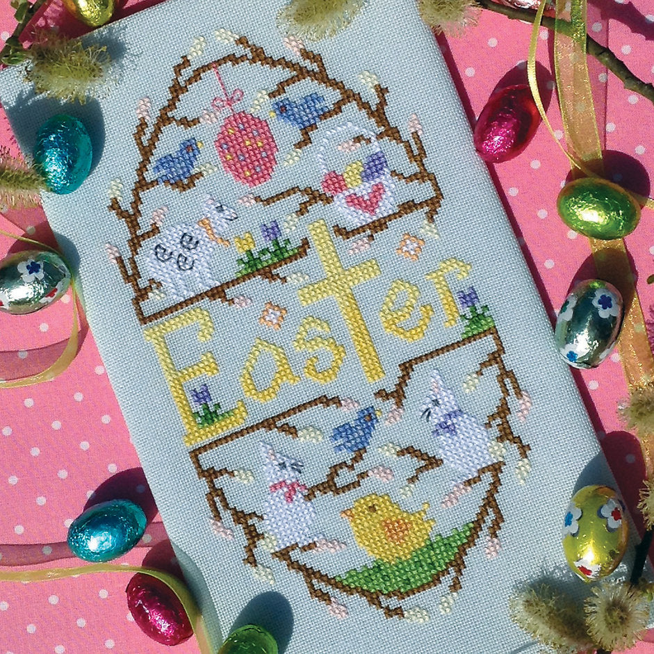 'Easter Willow' cross stitch, featuring a cute lamb, bunnies, Spring birds, flowers eggs and a chirpy little chick nesting amongst an Easter egg shaped from pusy willow. The design contains mostly whole cross stitches. A few backstitches are used to add detail on the design.