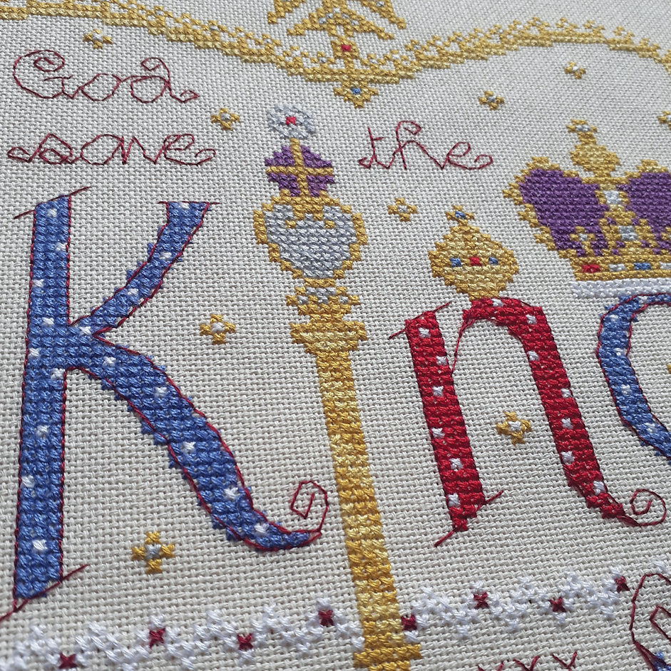 'God Save the King', commemorative cross stitch design to celebrate the coronation of King Charles III, stitched in regal colours incorporating a magnificent crown.