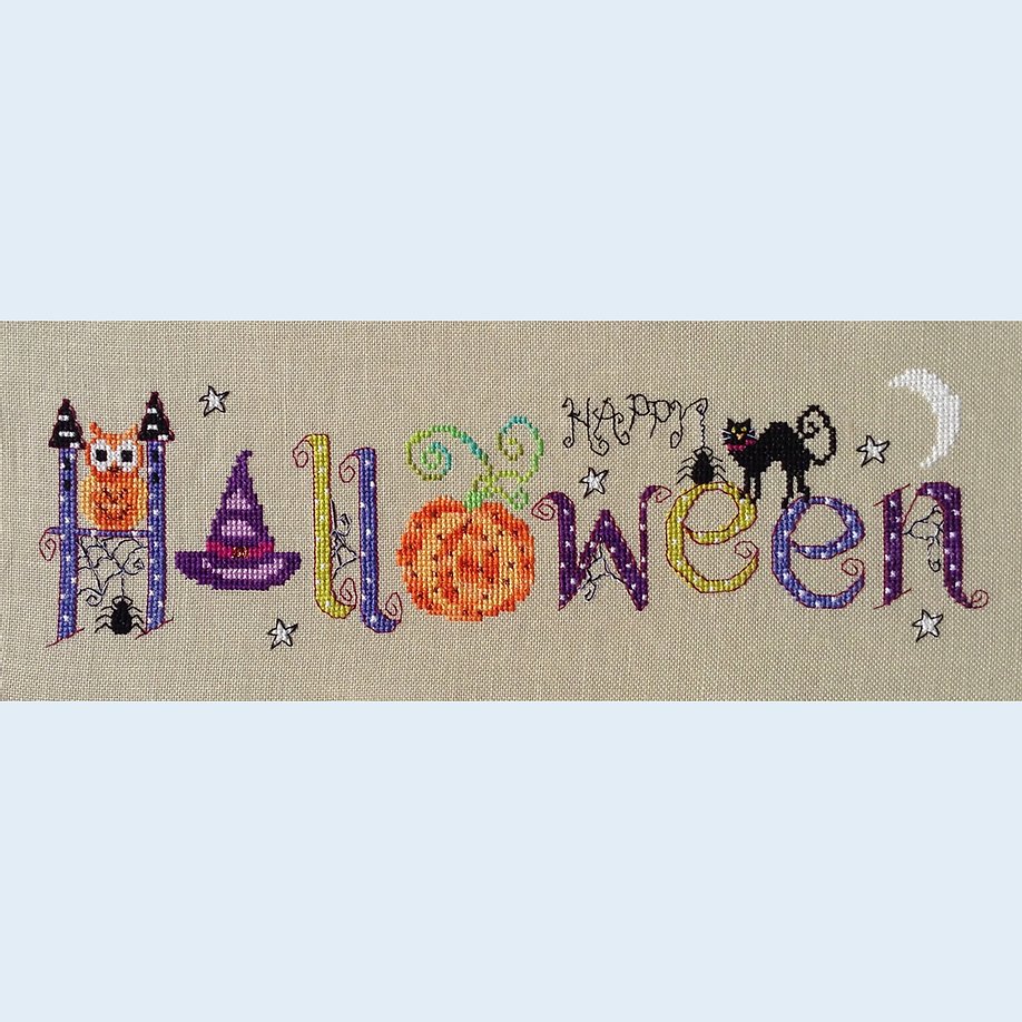 Halloween cross stitch design, full of spooky motifs to stitch within the fun and colourful lettering.