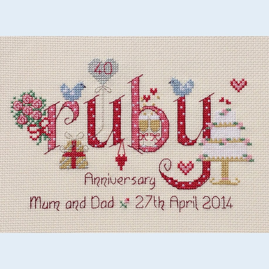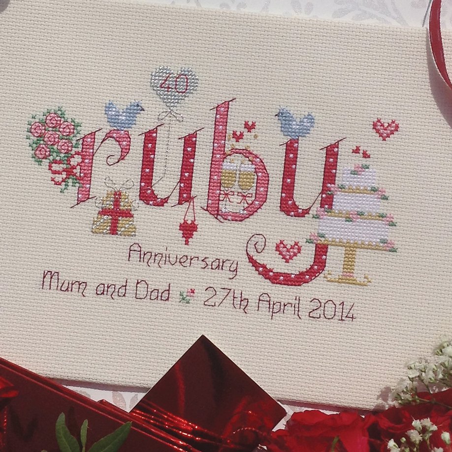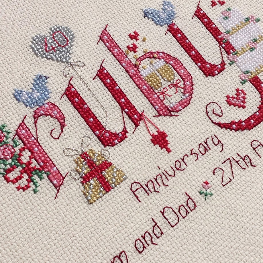 A contemporary Ruby Anniversary cross stitch design intended to be stitched as a gift for a special couple celebrating their 40th wedding anniversary. Quirky bespoke lettering creates the 'ruby' word surrounded by romantic motifs, including a glorious wedding cake. Fun and quick to stitch as each letter and motif come together to create a modern anniversary themed sampler for a special couple.