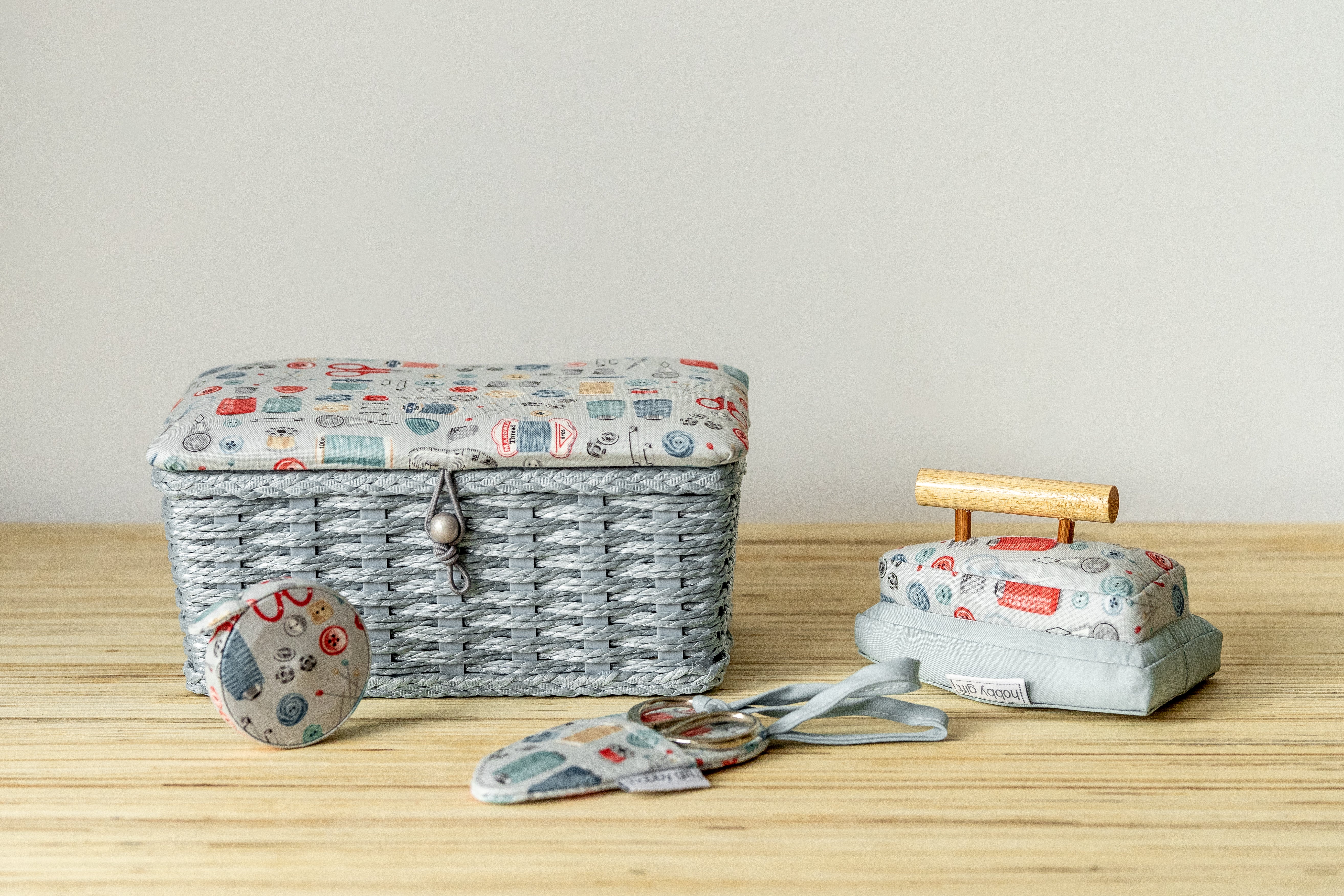 Woven Basket, Pin Cushion, Tape Measure and Scissors in Case - Stitch In Time - Matching Set