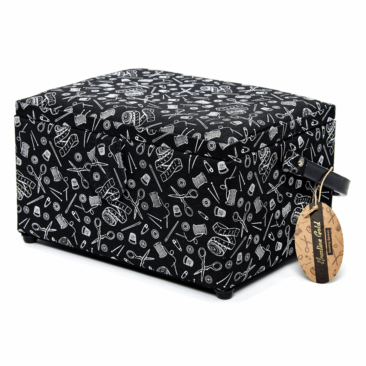 Stylish medium sewing box featuring the Hemline Gold signature print