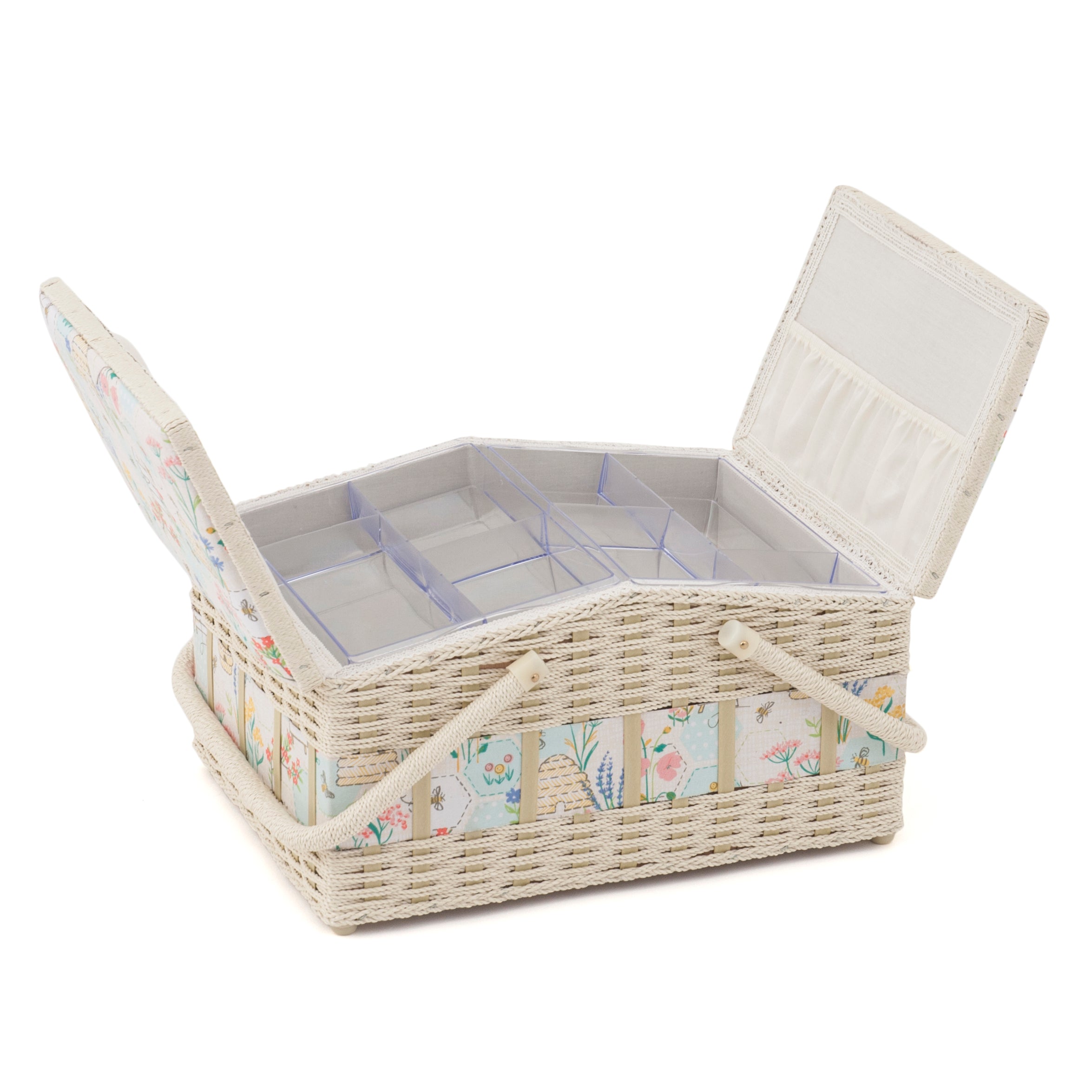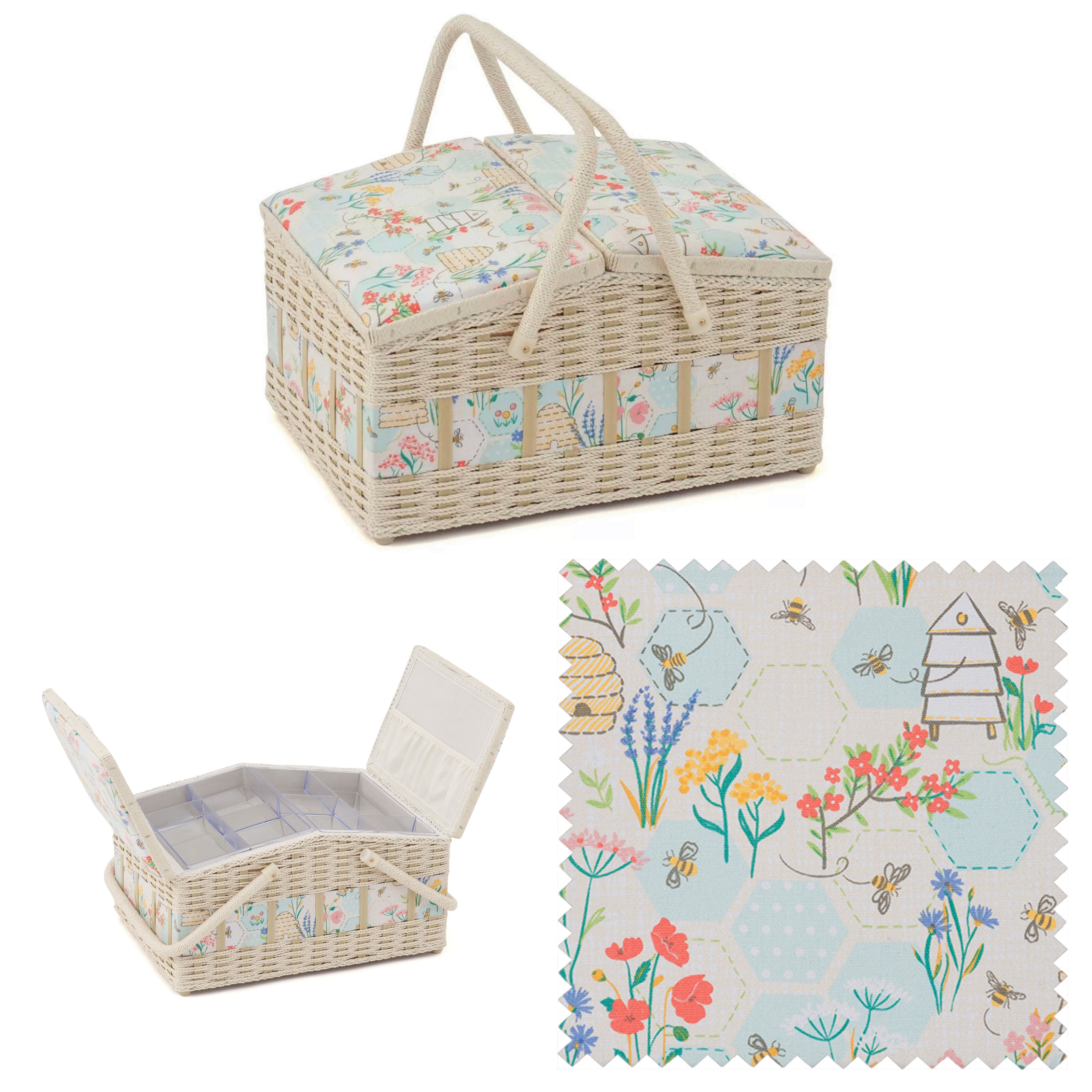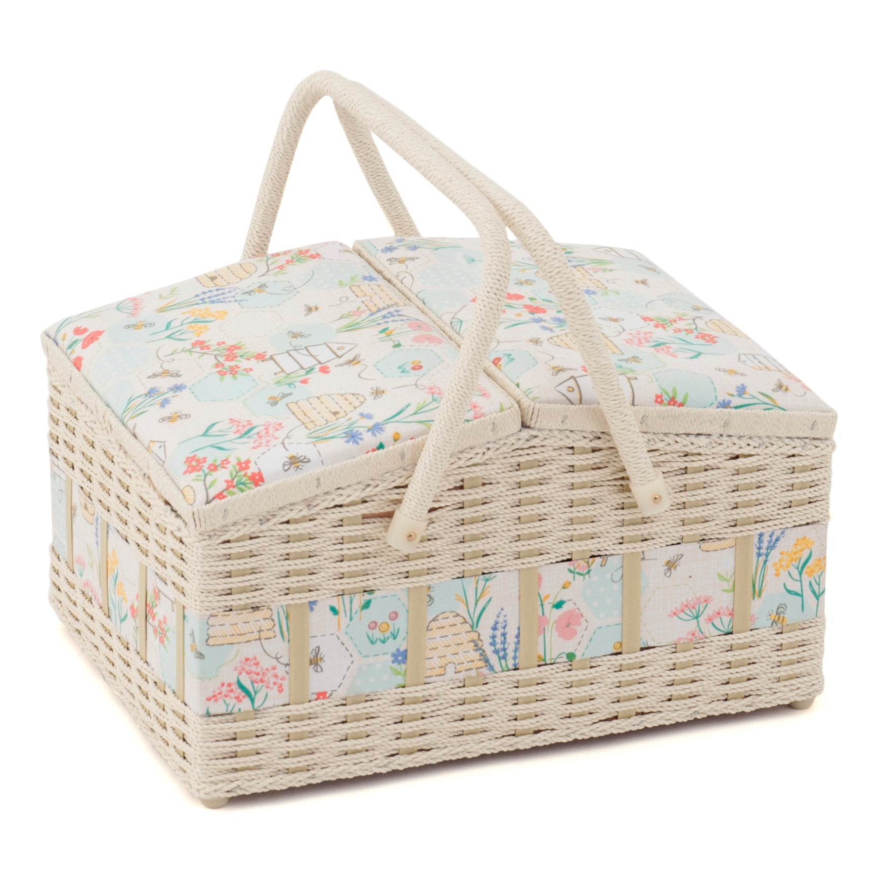 This stylish Sewing Bee Basket has wicker detail around the side and the top is covered in a beautiful fabric featuring beehives, flowers and bumblebees. The hamper style is perfect for storing all your sewing and craft essentials.