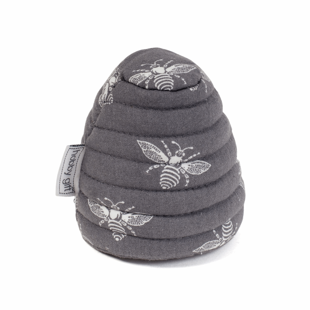 This stylish pin cushion is designed in the shape of a beehive is covered in a beautiful grey fabric featuring bumblebees.