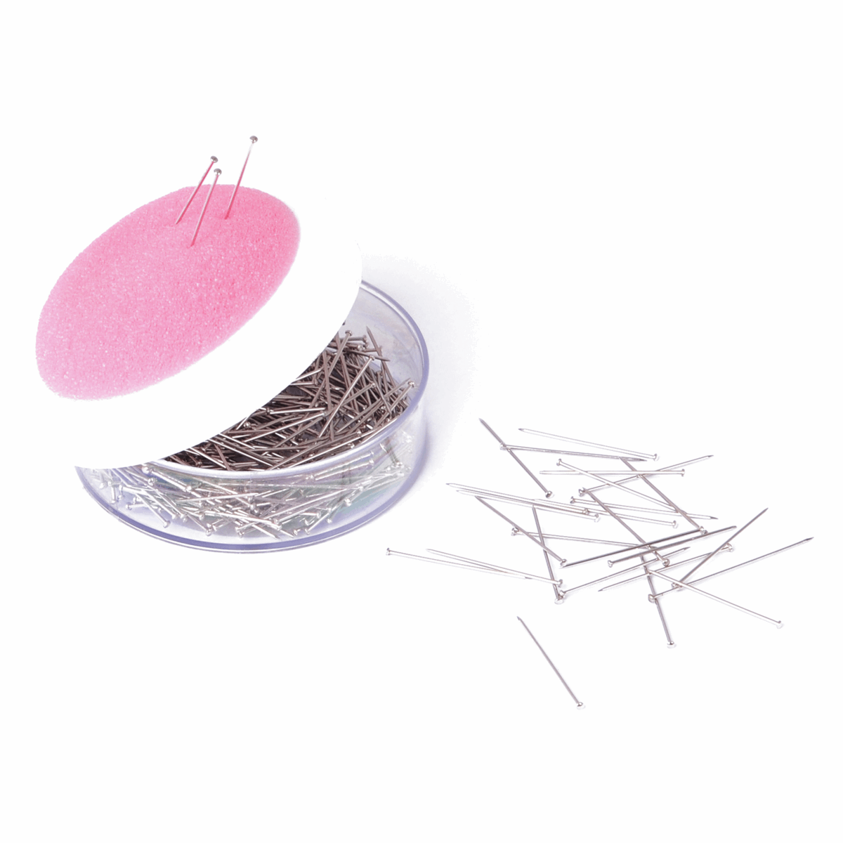 Acrylic tub of tempered steel pins with a foam pincushion top to make pinning garments easy, quick and tidy.