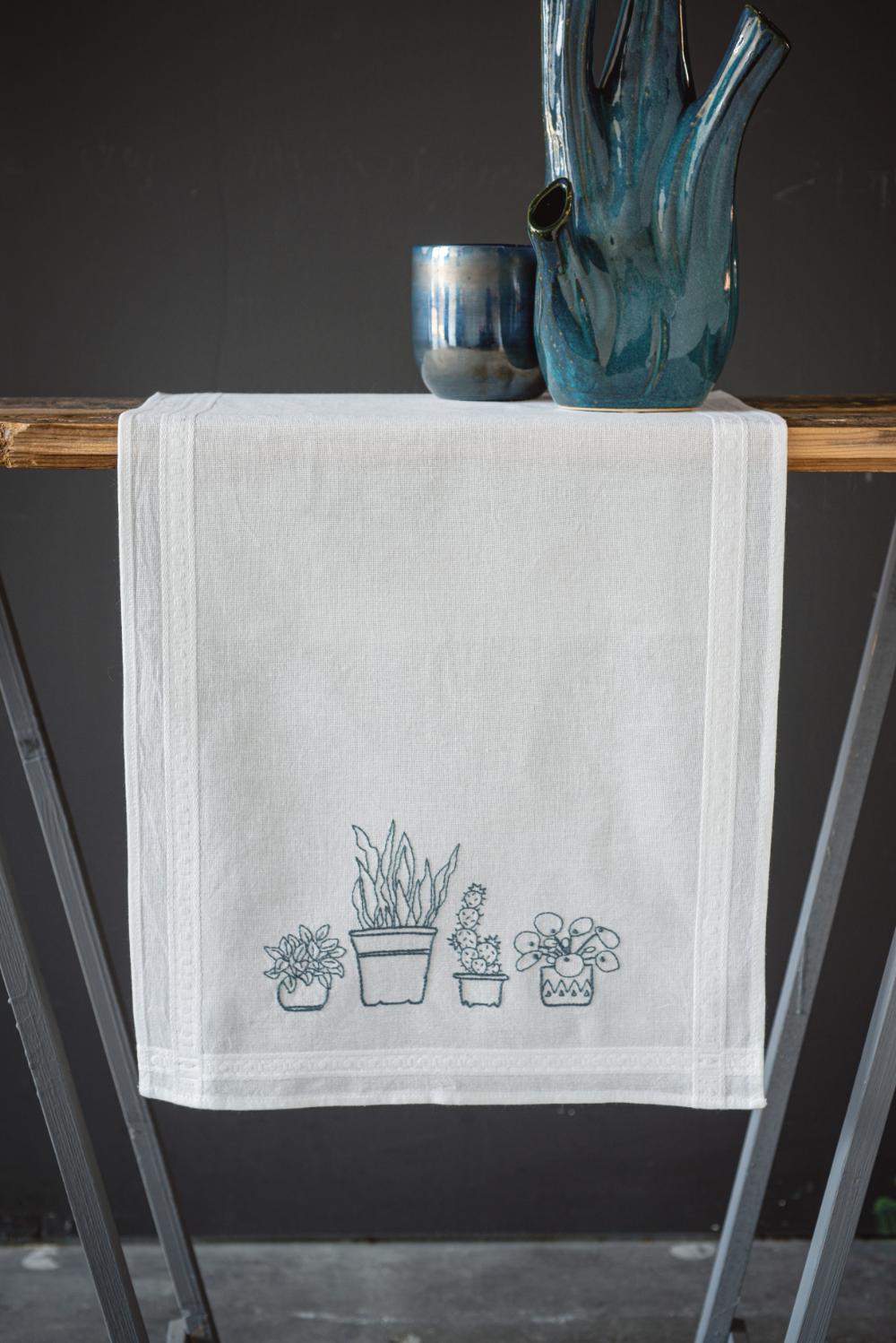 • Printed design to be stitched with pre-sorted cotton threads onto white, cotton fabric with hemmed, inwoven border.