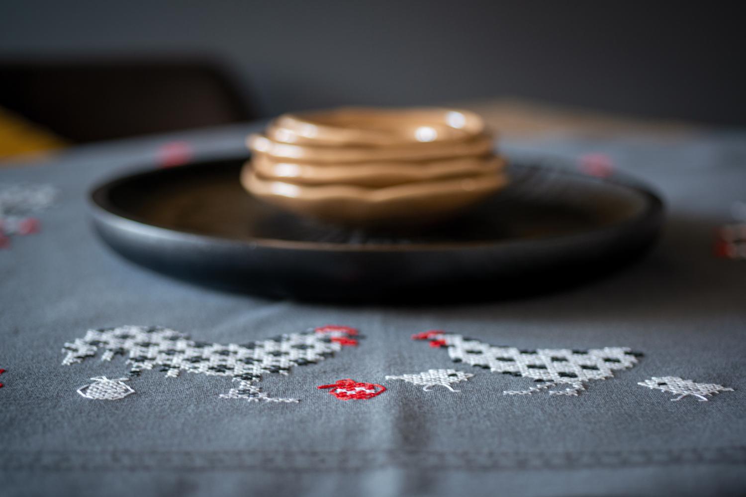 - Embroidered tablecloth.