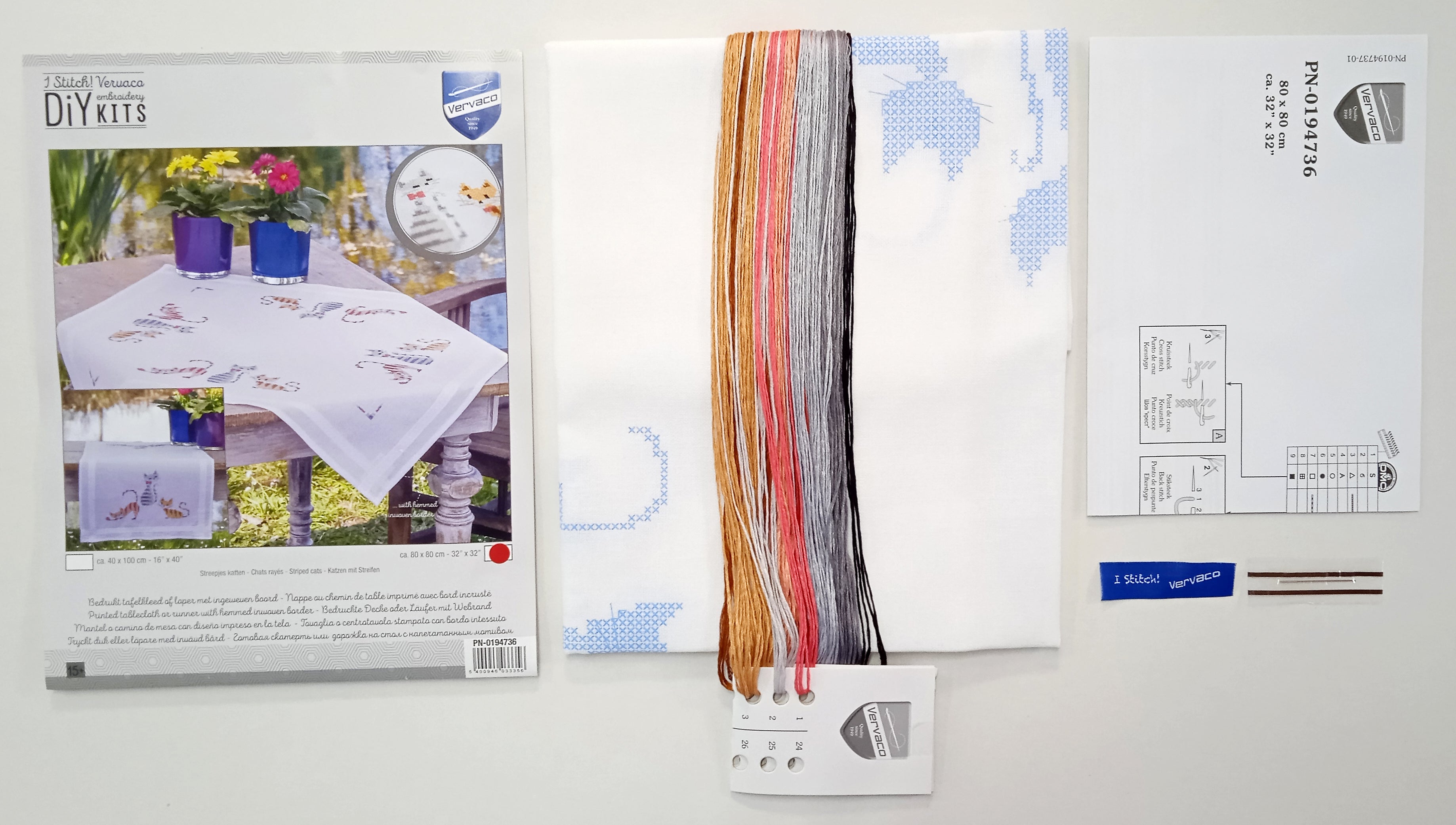 - Printed design to be stitched with pre-sorted cotton threads onto white, cotton fabric with hemmed inwoven border.