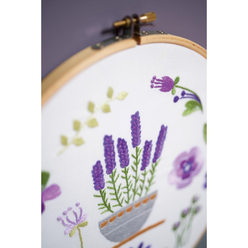 - Design to be embroidered with pre-sorted cotton threads onto white, polycotton embroidery fabric. Kit also includes: instructions in eight languages (ENG, NL, FR, GER, IT, SP, RU, SW); chart; needle; front sheet picture and wooden embroidery ring.