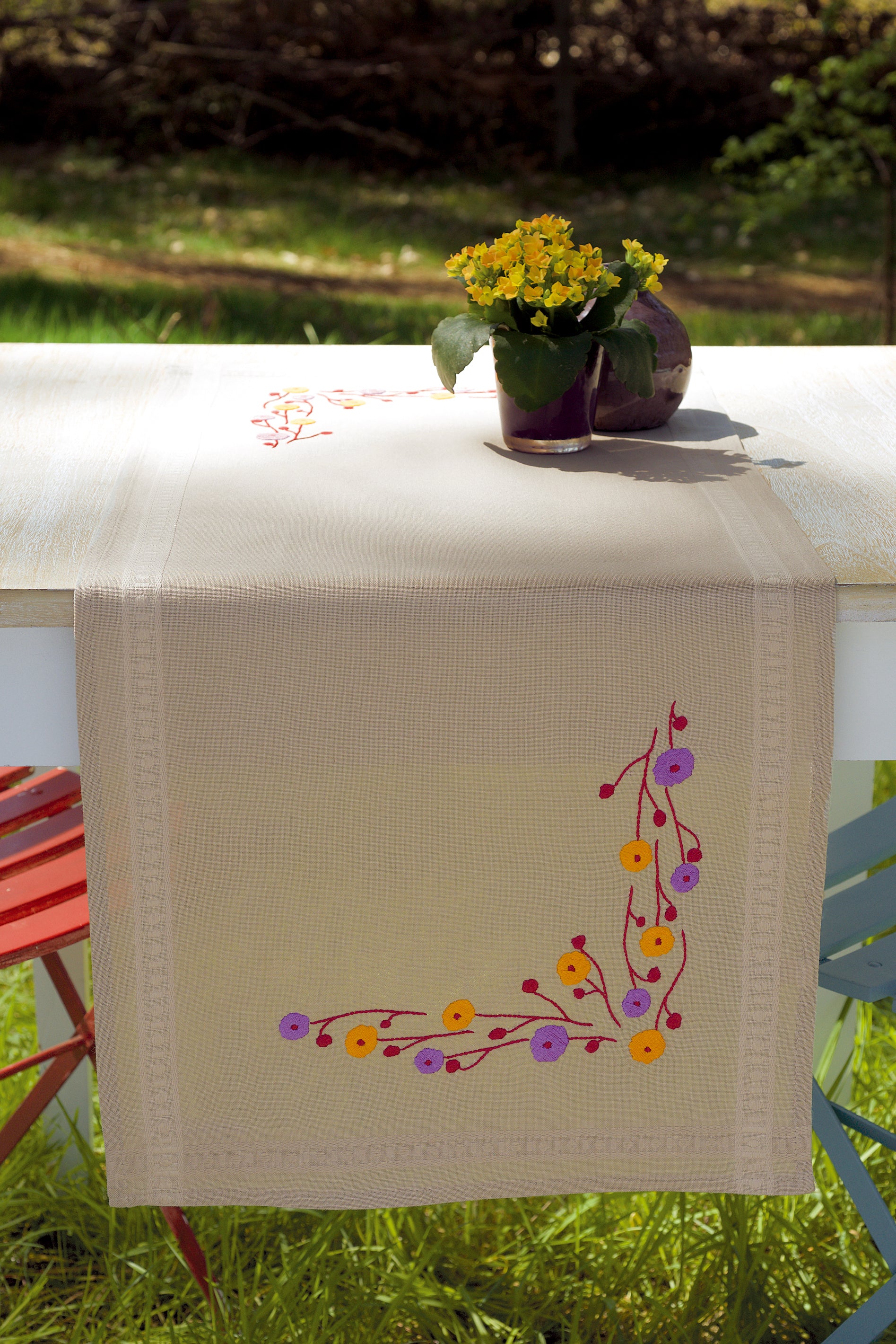 - Printed design to be stitched with pre-sorted cotton threads onto ecru, cotton fabric with hemmed, inwoven border.