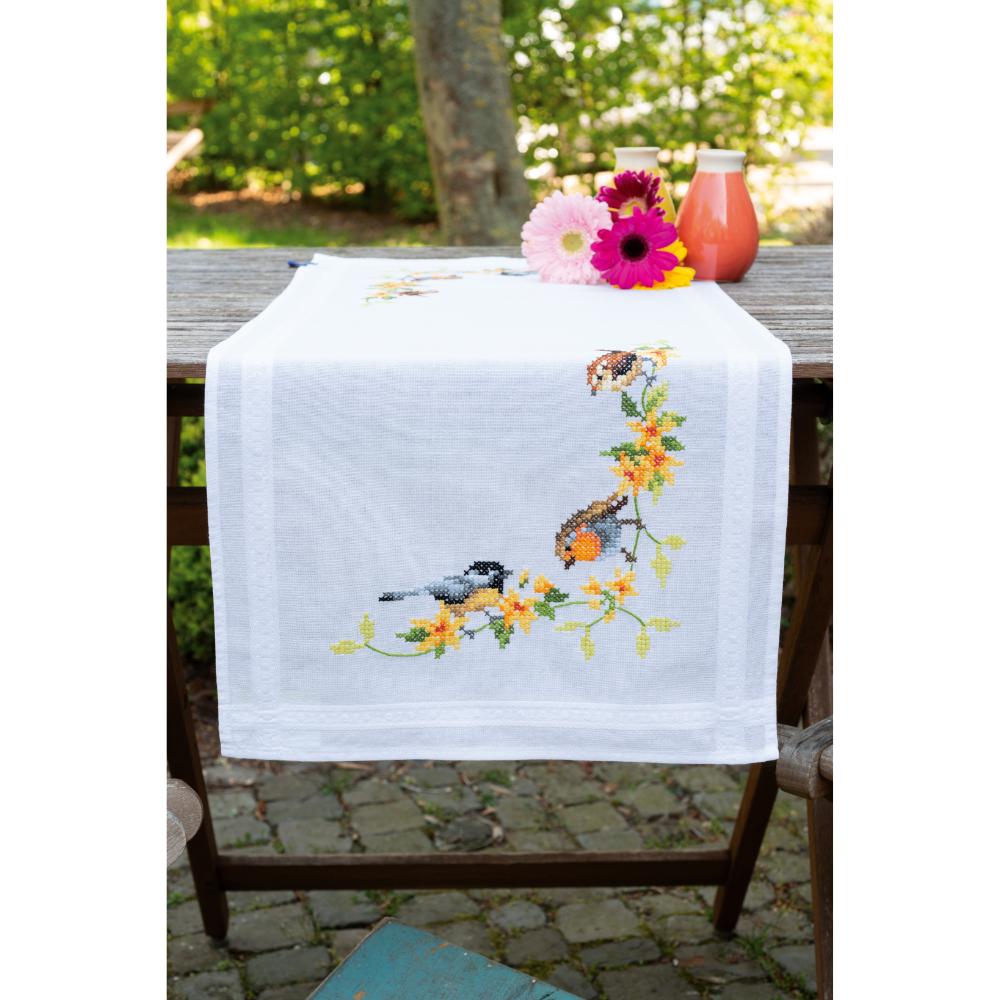 - Printed design to be stitched with pre-sorted cotton threads onto white, cotton fabric with hemmed, inwoven border.