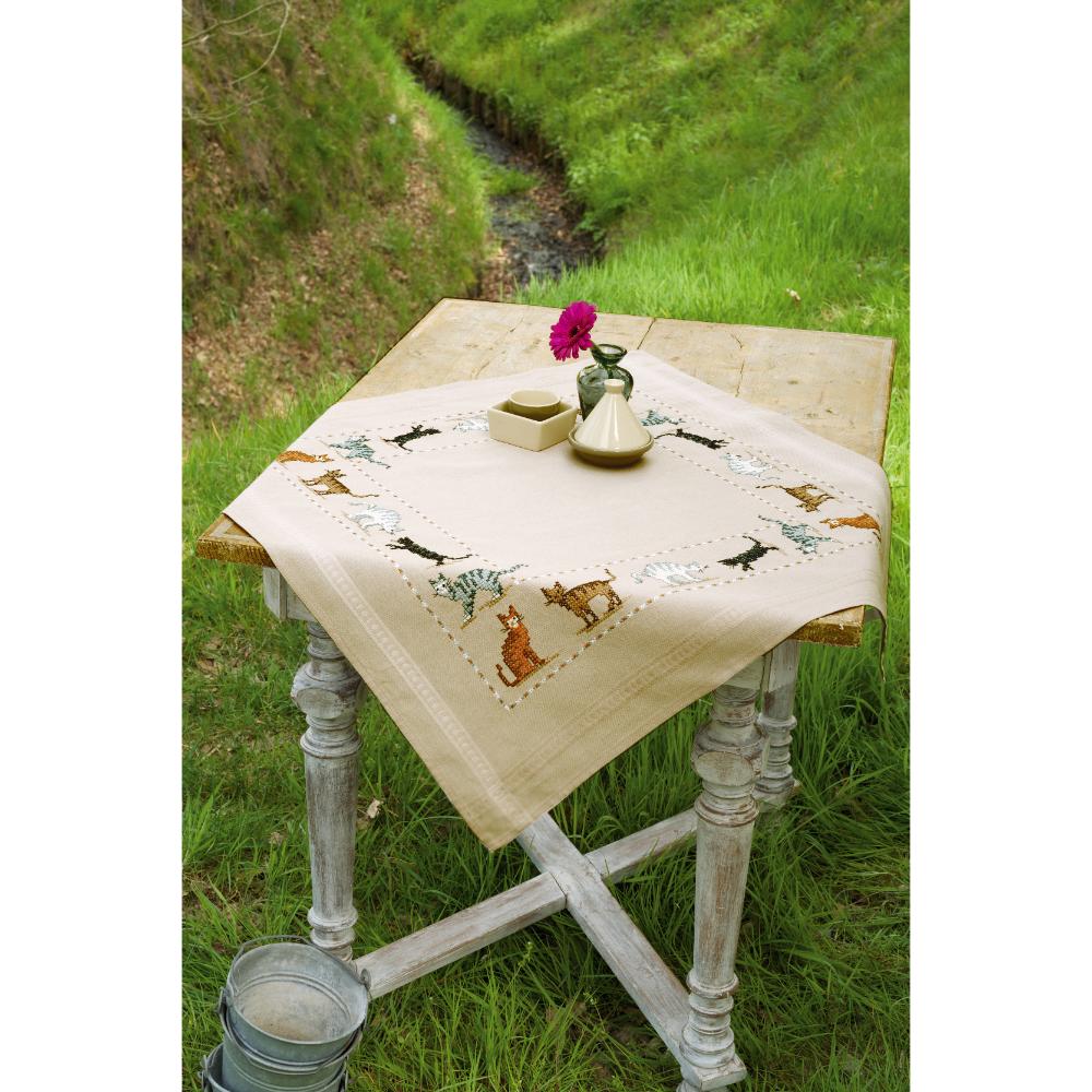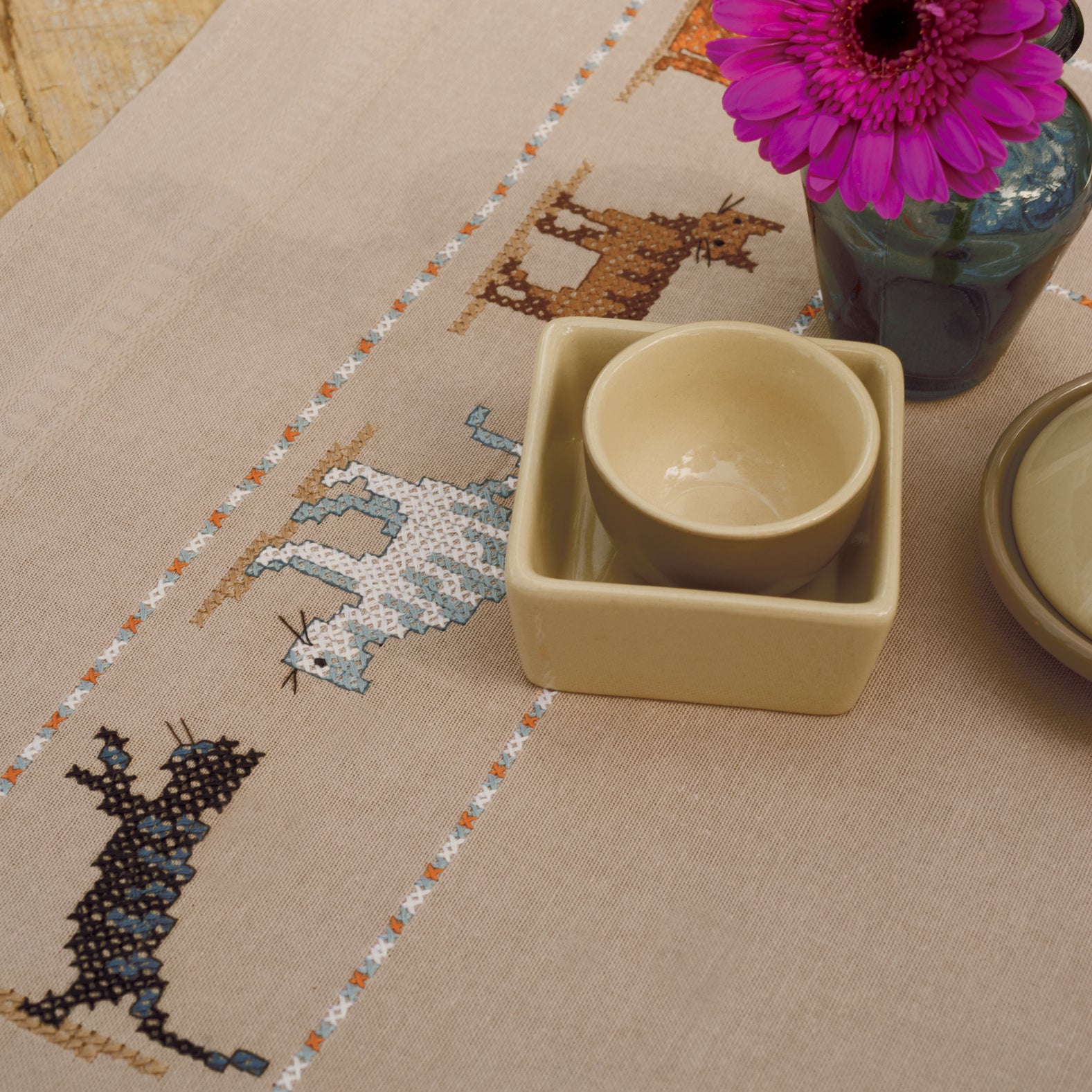- Printed design to be stitched with pre-sorted cotton threads onto ecru, cotton fabric with hemmed, inwoven border.