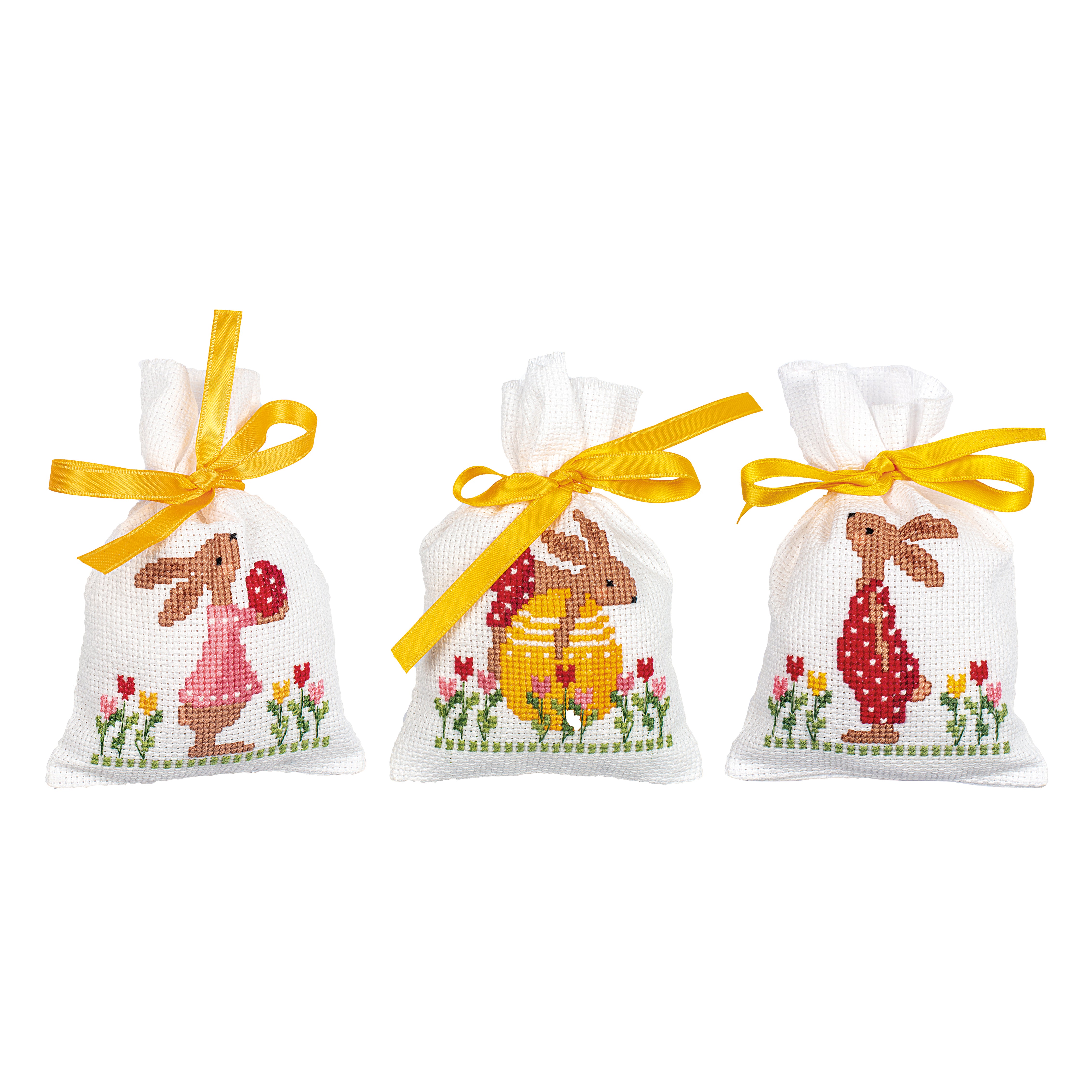 Counted Cross Stitch Kit Draw String Gift Bags ~ Easter Rabbits in Tulip Garden Set of 3