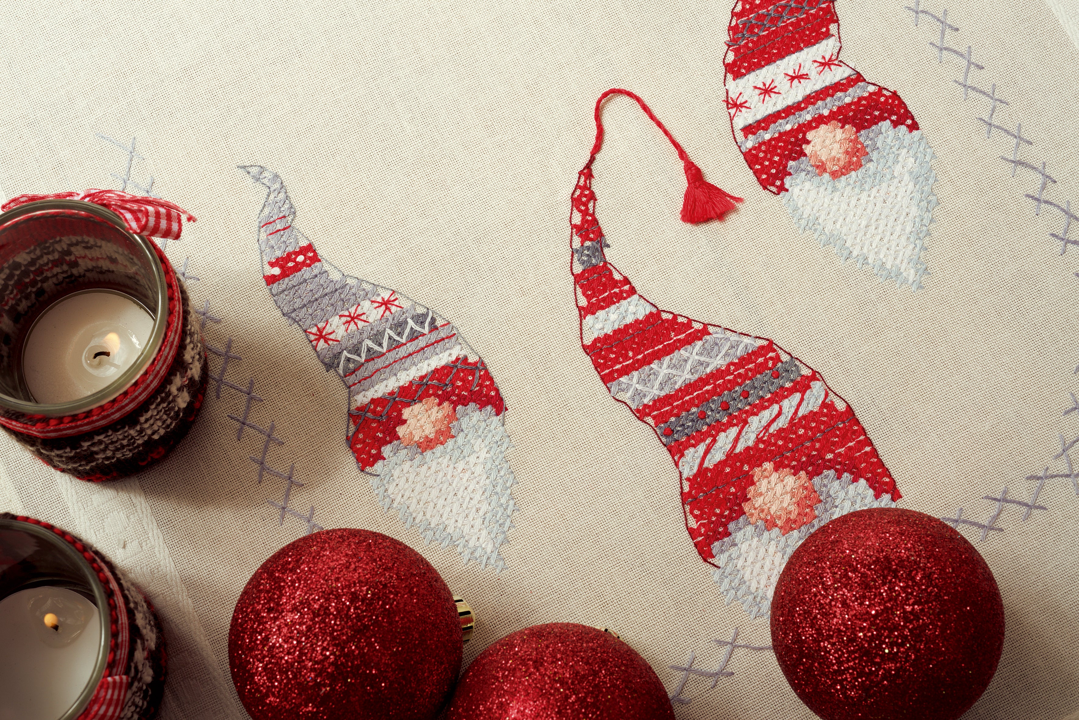 - Kit also includes instructions in 8 languages (ENG, NL, FR, GER, IT, SP, RU, SW), large-square design, needle, front sheet picture and red tassels for elves' hats. The printed design will wash out.