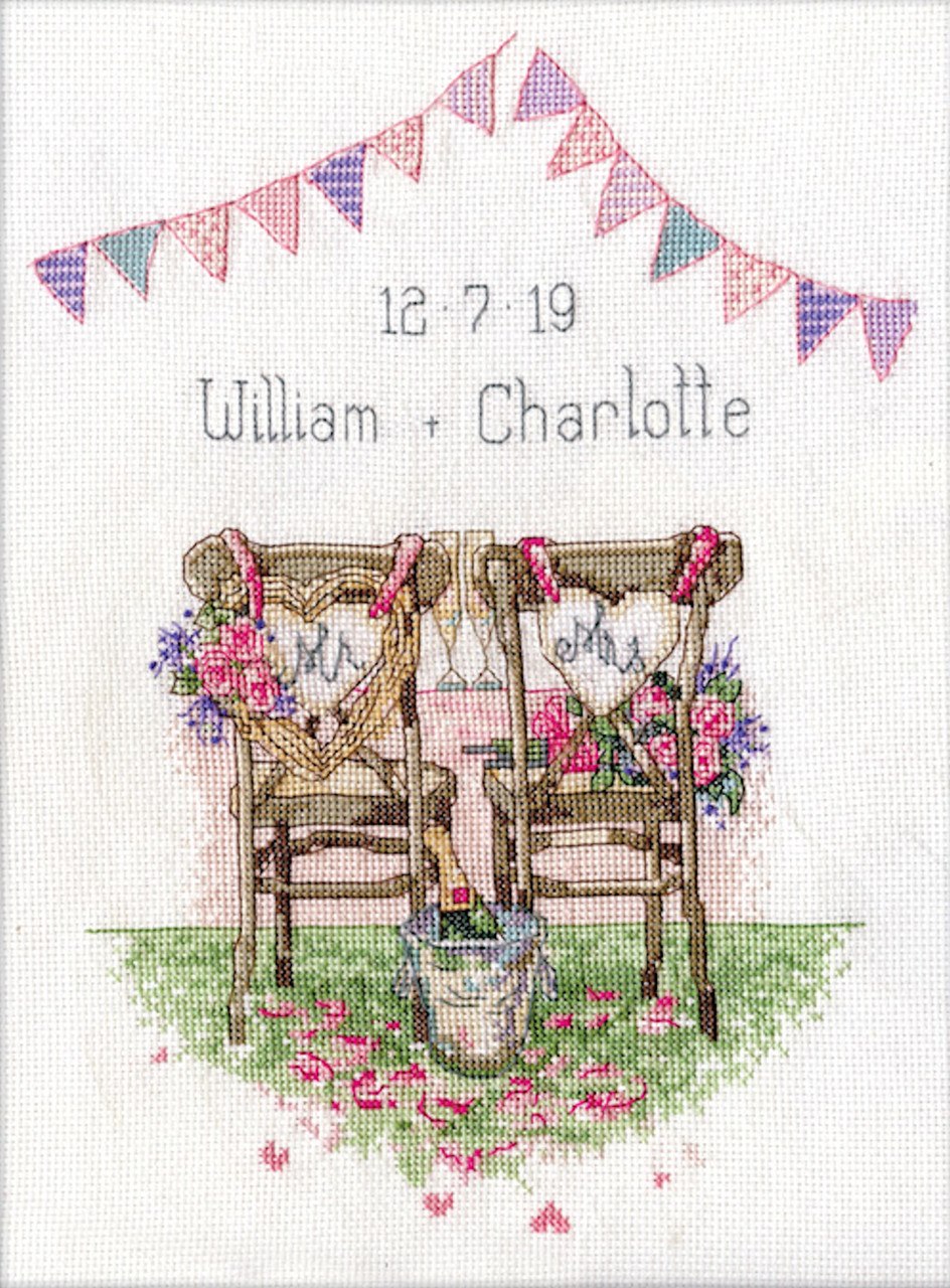 A beautiful wedding cross stitch kit which features chairs with Mr and Mrs hung on the backs.