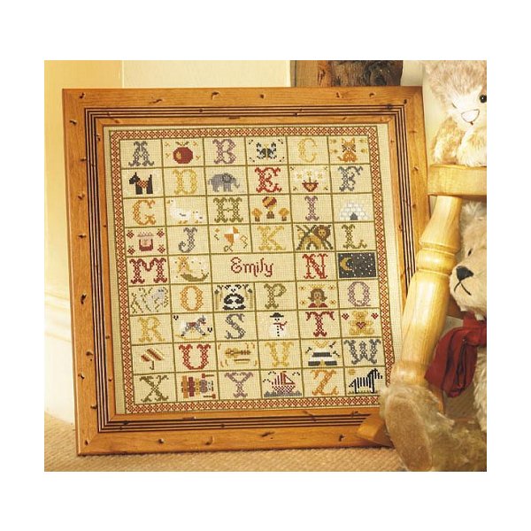 A traditional sampler set out with the full alphabet and appropriate nursery motifs. The design is stitched using a muted thread palette on our gorgeous vintage fabric. This design is suitable for either a boy or a girl.