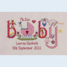 A sweet sampler to welcome a new born baby surrounded by baby motifs.