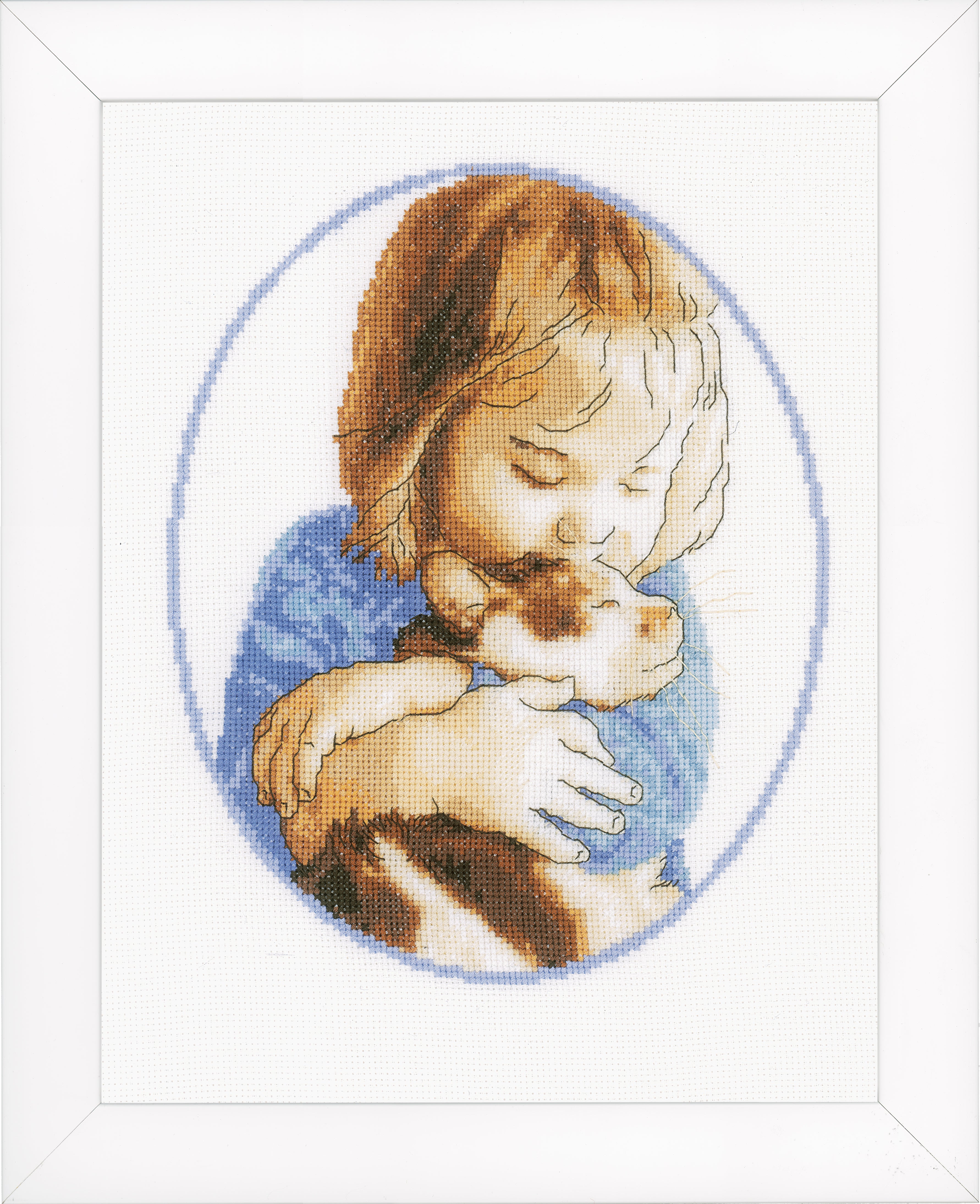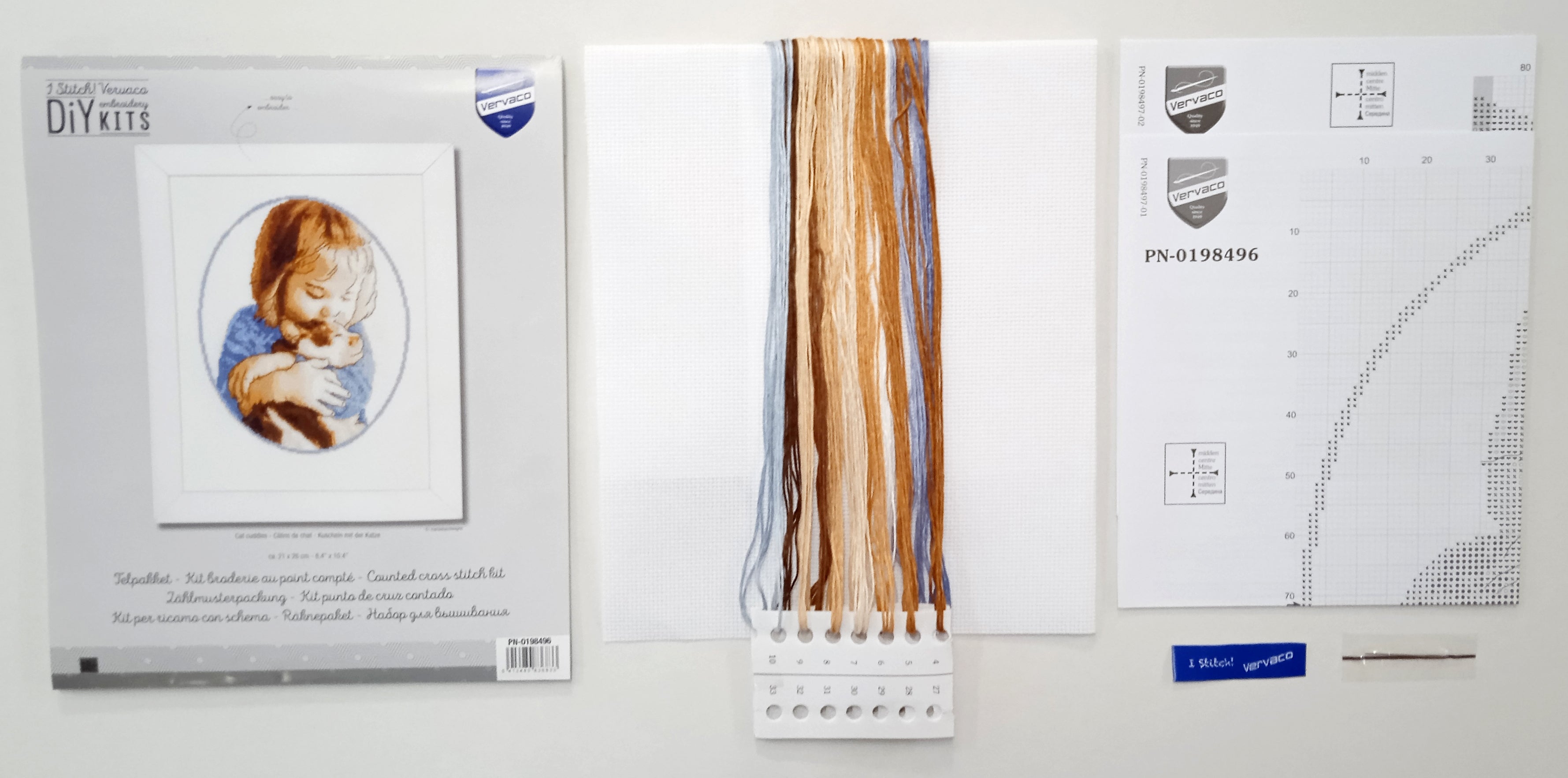 - Kit includes: 14 count, white, cotton, aida fabric; pre-sorted, stranded cotton threads; needle; large-square charted design; front sheet picture and instructions in eight languages (EN, NL, FR, GER, IT, SP, RU, SW).