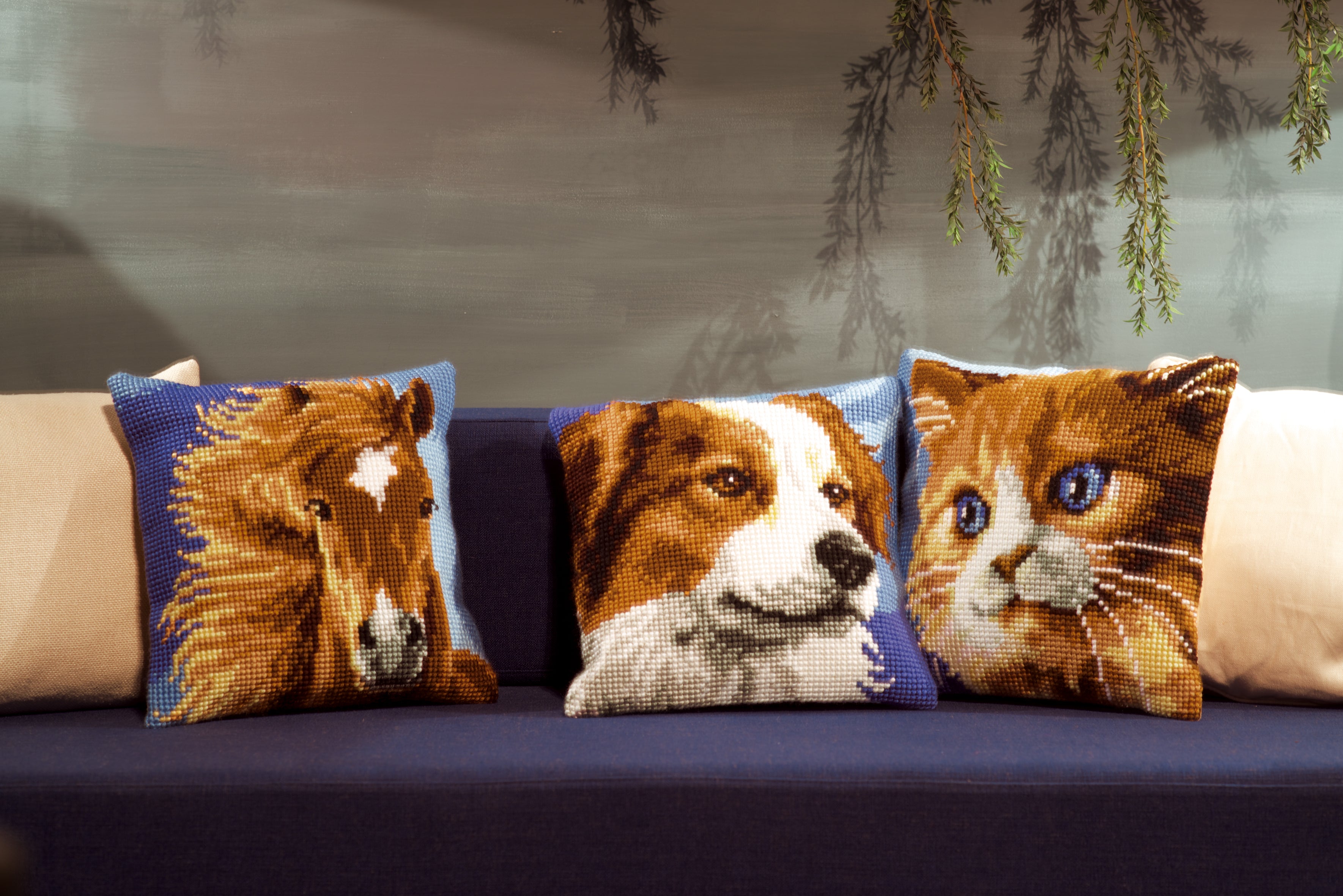 - Cushion with cross stitch design.