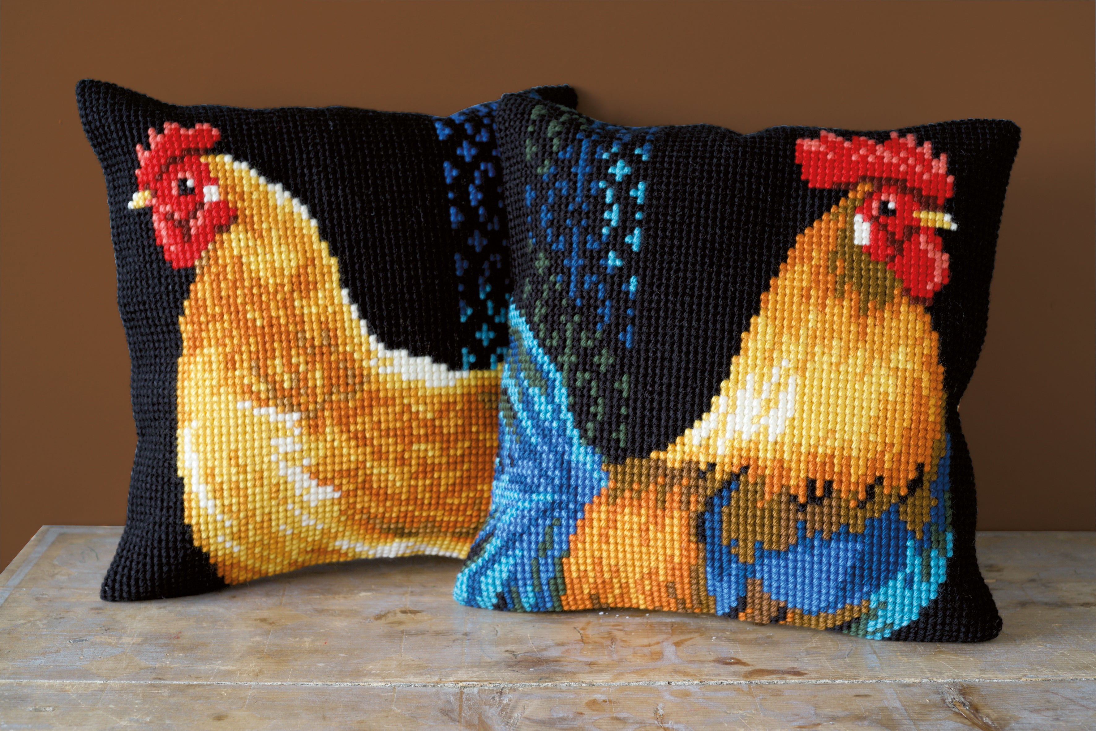 - Kit includes: hand-painted, cotton, large hole canvas fabric (18 holes/10cm, 4.5 stitches/inch); thick acrylic yarn; needle, frontsheet picture; instructions in 8 languages (EN, NL, FR, GER, IT, SP, RU, SW).