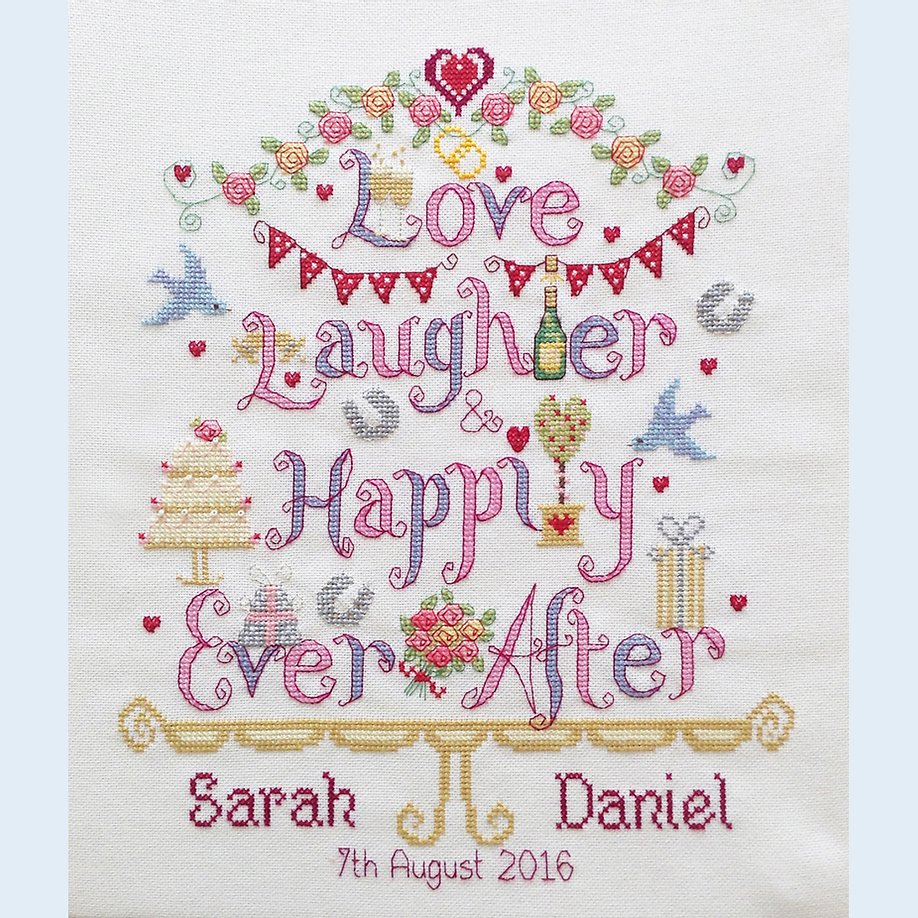 'Love laughter...' is a beautiful wedding sampler incorporating the words 'Love, Laughter & Happily Ever After' designed to reflect a sumptuous wedding cake.