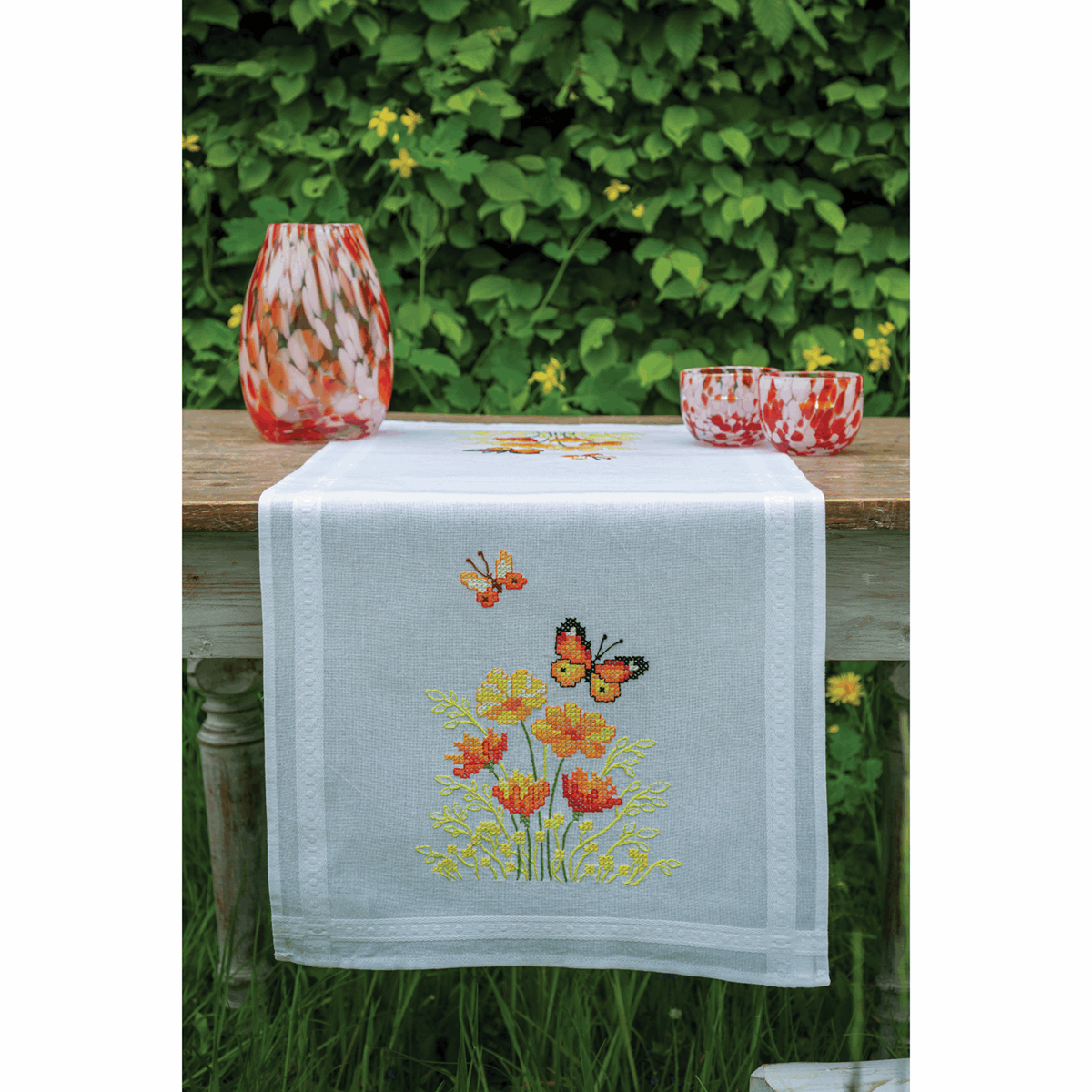 Vervaco ~ Embroidery Kit ~ Table Runner ~ Orange Flowers and Butterflies