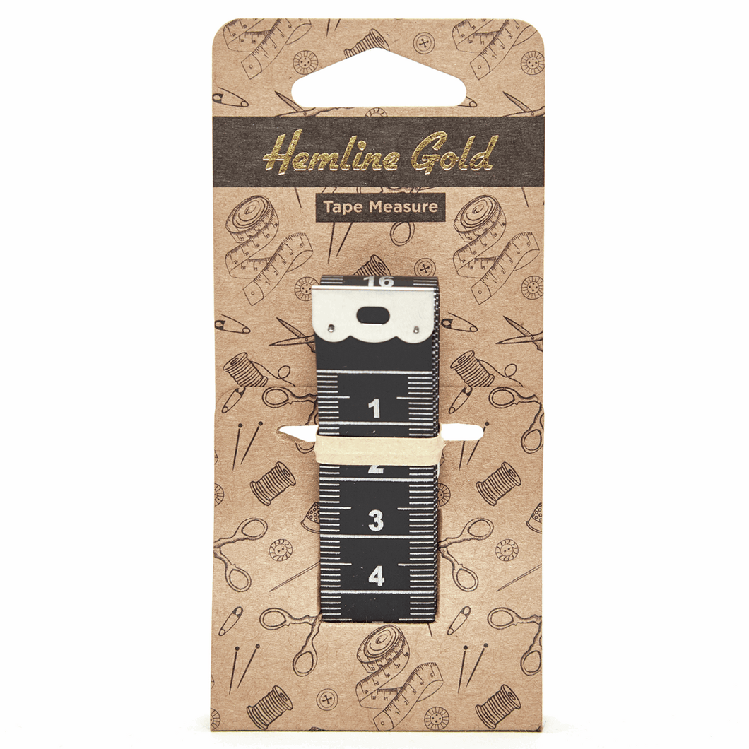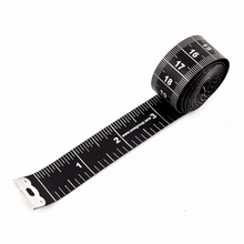 Double sided tape measure featuring metric and imperial measurements in silver print